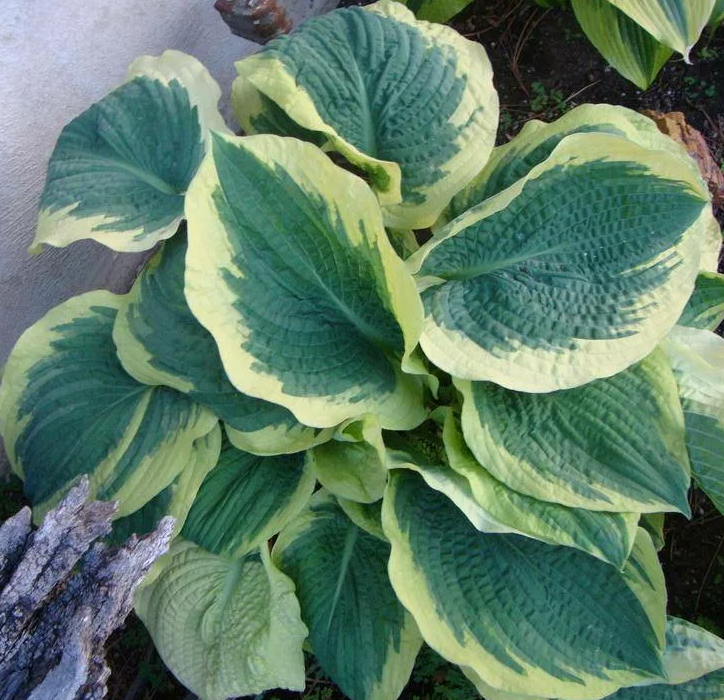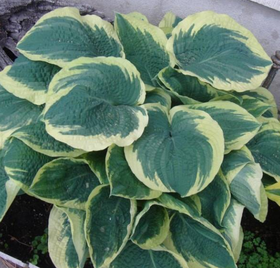 Большая куполообразная хоста с крупными голубовато-зелёными листьями в белом обрамлении. Поверхность листьев волнистая и гофрированная, не повреждается слизнями и улитками. Белые колокольчатые цветки распускаются в июле. Отлично сочетается с крупными тенелюбивыми многолетниками дармерой, клопогоном, купеной и др.Высота: 80 см;