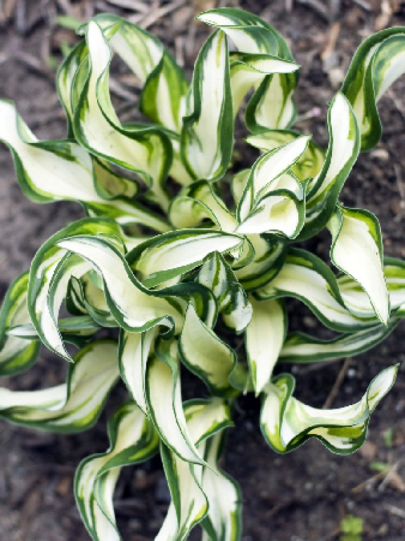 Миниатюрная хоста эффектного вида, длинные листья ланцетного типа, причудливо закручиваются, кайма зеленая с изумрудным подбоем, Н-25см,Ø20смПосадка : в мае, на глубину 5 см.
