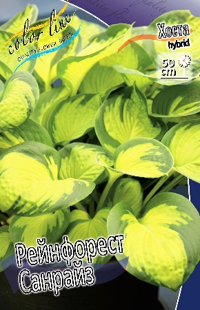 Относится к группе многолетников, высота растения 20-30см. ширина растения: 30-35см., куст:желтый с темно-зеленой каймой, складчатый имеет слегка чашевидные листья, сильно рифленые. На глянцевых светло зеленых листьях постепенно развиваются золотистый центр с темно-зелеными краями. Центр листа постепенно осветляется в течение лета. Лист хосты Rainforest Sunrise имеет самый лучший цвет, когда она получает утреннее солнце. Цветы лавандовые.Характеристики
