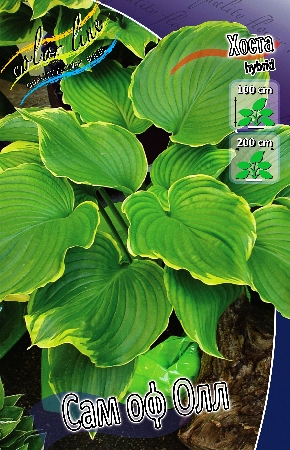 Очень большие (30х40 см) округлые жатые листья, темно зеленые с широкой желтой (желто-зеленой) каймой. Кайма у этого сорта шире, чем у других вариегатных спортов 'Sum and Substance'. Размеры очень крупная хоста (ХL). Размер куста примерно 80х100 см , взрослые кусты превышают в диаметре 1 м. Требования полутень / тень.Характеристики