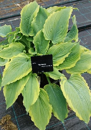Большая хоста, разрастается в ширину до 120 см. Спорт сорта «Sea Gulf Stream». Листья размером 31х20 см, высотой 50 см, яркие, контрастные, зелёные с сильно рифлёной золотистой каймой, сердцевидные, с глубокими прожилками и слегка обратно-чашевидной формы.Цветки бледно-лавандовые. Цветоносы аркообразные, высотой 60-70 см.