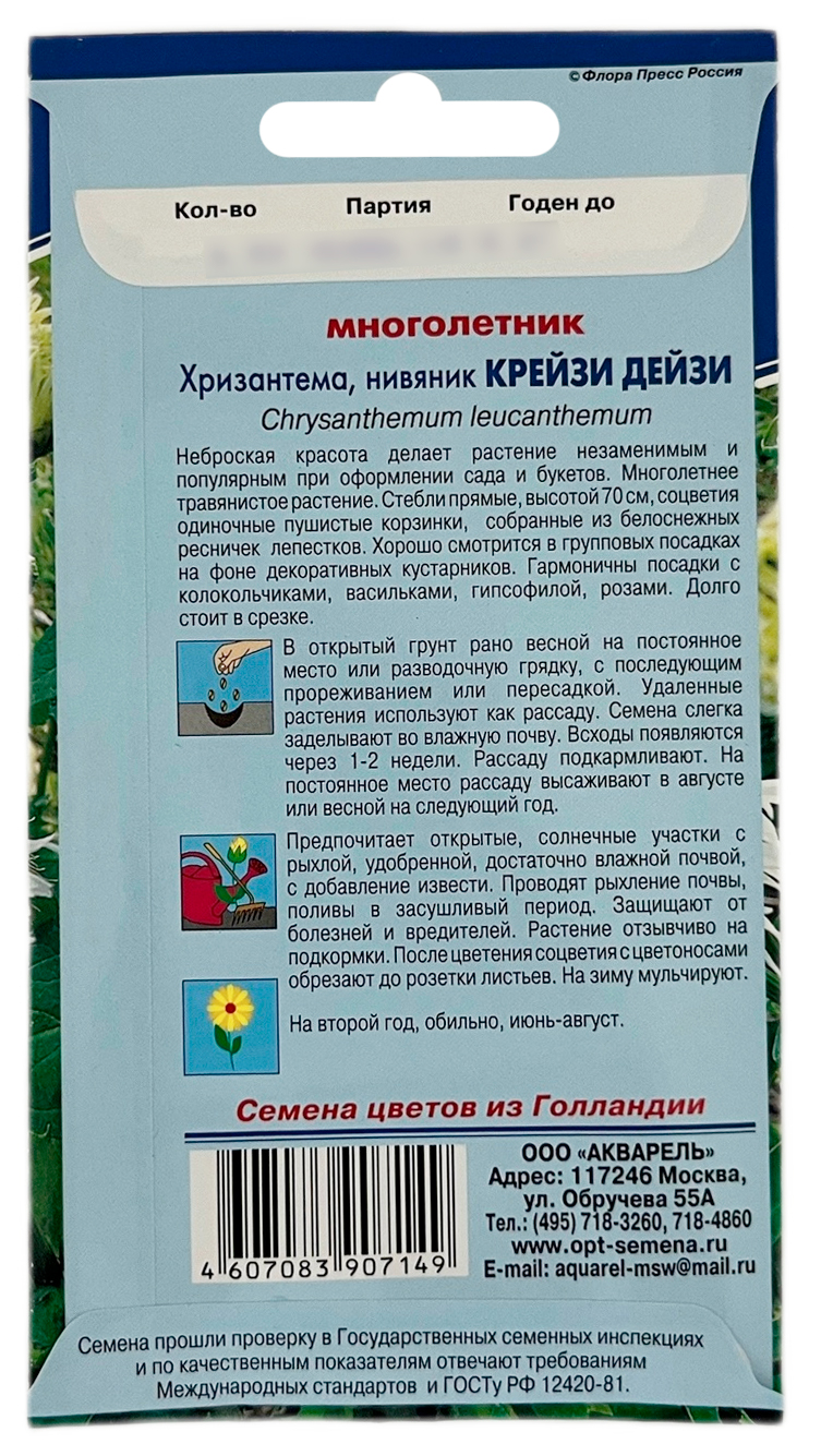 Хризантема КРЕЙЗИ ДЕЙЗИ АКВАРЕЛЬНеброская красота делает растение незаменимым и популярным при оформлении сада и букетов. Многолетнее травянистое растение. Стебли прямые, высотой 70 см, соцветия одиночные пушистые корзинки, собранные из белоснежных ресничек лепестков. Хорошо смотрится в групповых посадках на фоне декоративных кустарников. Гармоничны посадки с колокольчиками, васильками, гипсофилой, розами. Долго стоит в срезке.