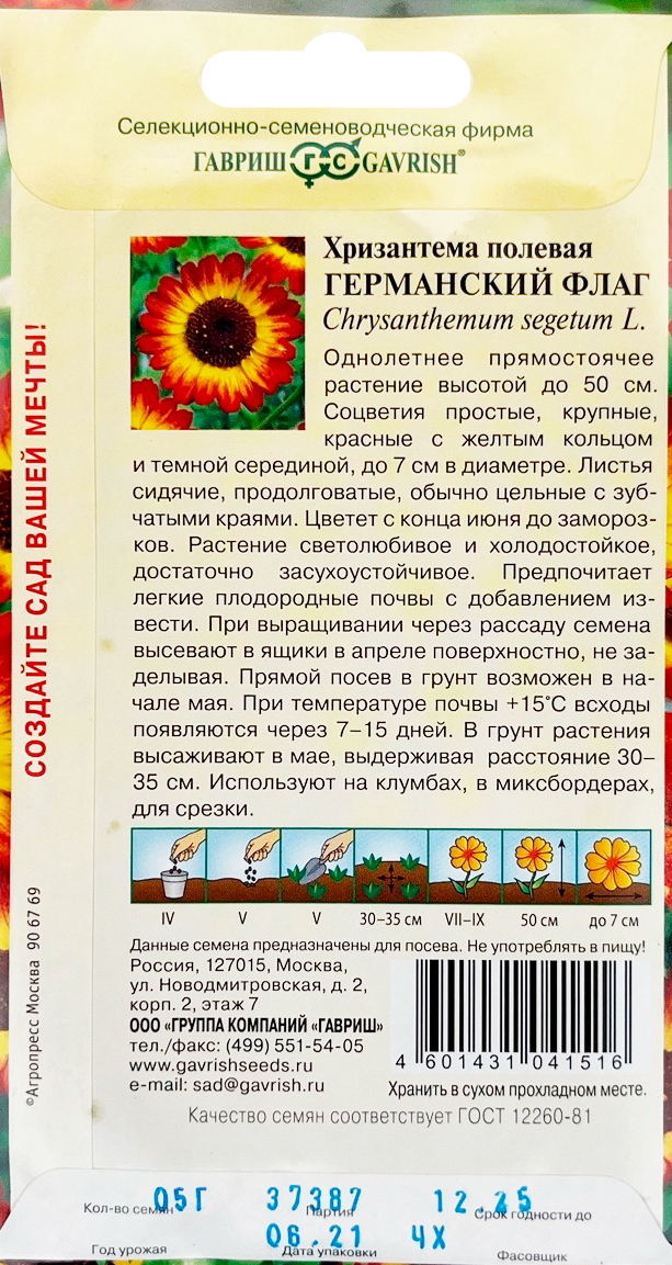 Хризантема Германский флаг 0,5 г H12Однолетнее прямостоячее растение высотой до 50 см. Соцветия простые, крупные, красные с желтым кольцом и темной серединой, до 7 см в диаметре. Листья сидячие, продолговатые, обычно цельные с зубчатыми краями. Цветет с конца июня до заморозков. Растение светолюбивое и холодостойкое, достаточно засухоустойчивое. Предпочитает легкие плодородные почвы с добавлением извести. При выращивании через рассаду семена высевают в ящики в апреле, прямой посев в грунт возможен в начале мая. При температуре почвы 15 °C всходы появляются через 7 -15 дней. В грунт растения высаживают в мае, выдерживая расстояние 30-35 см. Используют на клумбах, в миксбордерах, для срезки.
