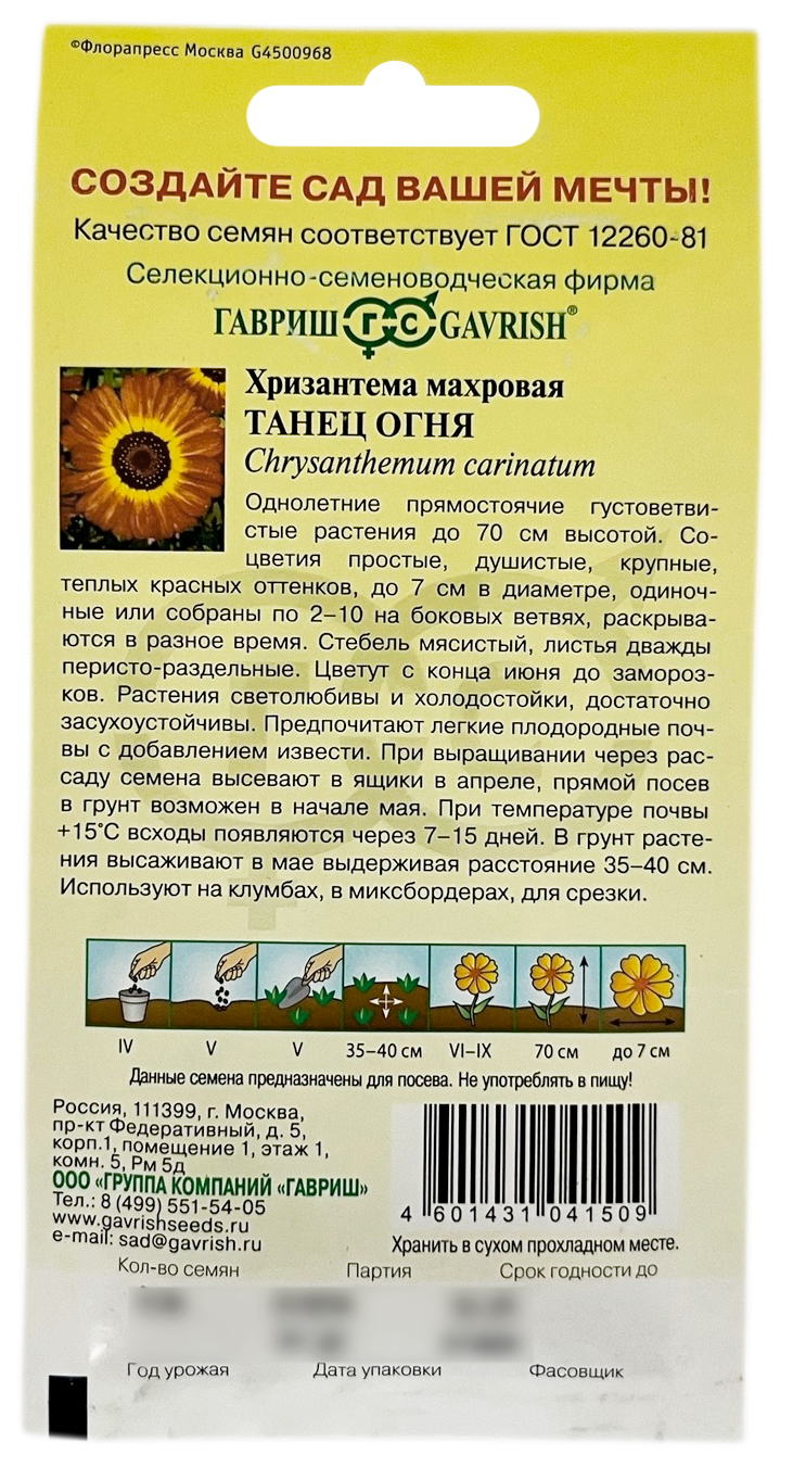 Хризантема Танец огня ГАВРИШОднолетние прямостоячие густоветвистые растения до 70 см высотой. Соцветия простые, душистые, крупные, теплых красных оттенков, до 7 см в диаметре, одиночные или собраны по 2-10 на боковых ветвях, раскрываются в разное время. Стебель мясистый, листья дважды перисто-раздельные. Цветут с конца июня до заморозков. Растения светолюбивы и холодостойки, достаточно засухоустойчивы. Предпочитают легкие плодородные почвы с добавлением извести. При выращивании через рассаду семена высевают в ящики в апреле, прямой посев в грунт возможен в начале мая. При температуре почвы 15 °C всходы появляются через 7 -15 дней. В грунт растения высаживают в мае выдерживая расстояние 35-40 см. Используют на клумбах, в миксбордерах, в срезке.