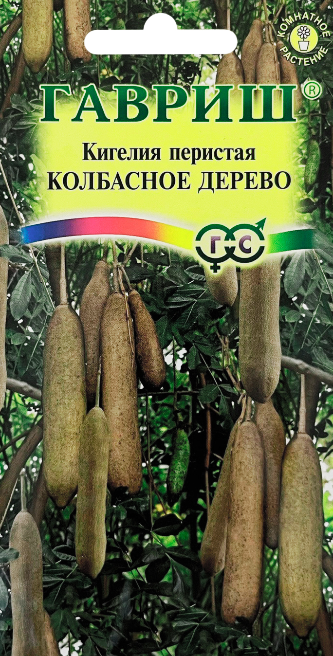 Кигелия Колбасное дерево ГАВРИШ (Kigelia pinnata (Jacq.) DC)Вечнозеленое дерево, на родине достигающее высоты 15 м. Листья сложноперистые, с 7-9 листочками, продолговато-эллиптическими, до 15 см длиной, цельные или пильчатые покраям, гладкие, снизу слегка опушенные. Цветки красные, двугубые, ширококолокольчатые, с длинной, кораллово-красной, до 7 см, трубочкой, длина долей губы 5-6 см. плоды длинные, похожие на колбасы, свисают на длинных, шнуровидно висячих побегах. При выращивании необходимо отметить следующие моменты: в природе - это довольно крупное дерево: высотой до 10-12 метров и с широкой кроной - до 6-9 метров. При выращивании предпочтительно полное солнце. Растение может выдерживать незначительные заморозки. Поэтому его можно рекомендовать для выращивания в зимних садах и хорошо освещенных холлах.