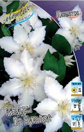 Очень эффектный сорт с чисто-белыми, крупными цветками и жётыми тычинками. Красивые, здоровые, тёмно-зелёные листья. Особенно хорош для выращивания у ограждений, стен, беседок, пергол, решёток и пр. Может карабкаться по натуральным опорам, напр. небольшим деревьям и кустарникам. Хорошо выглядит на тёмном фоне.Характеристики