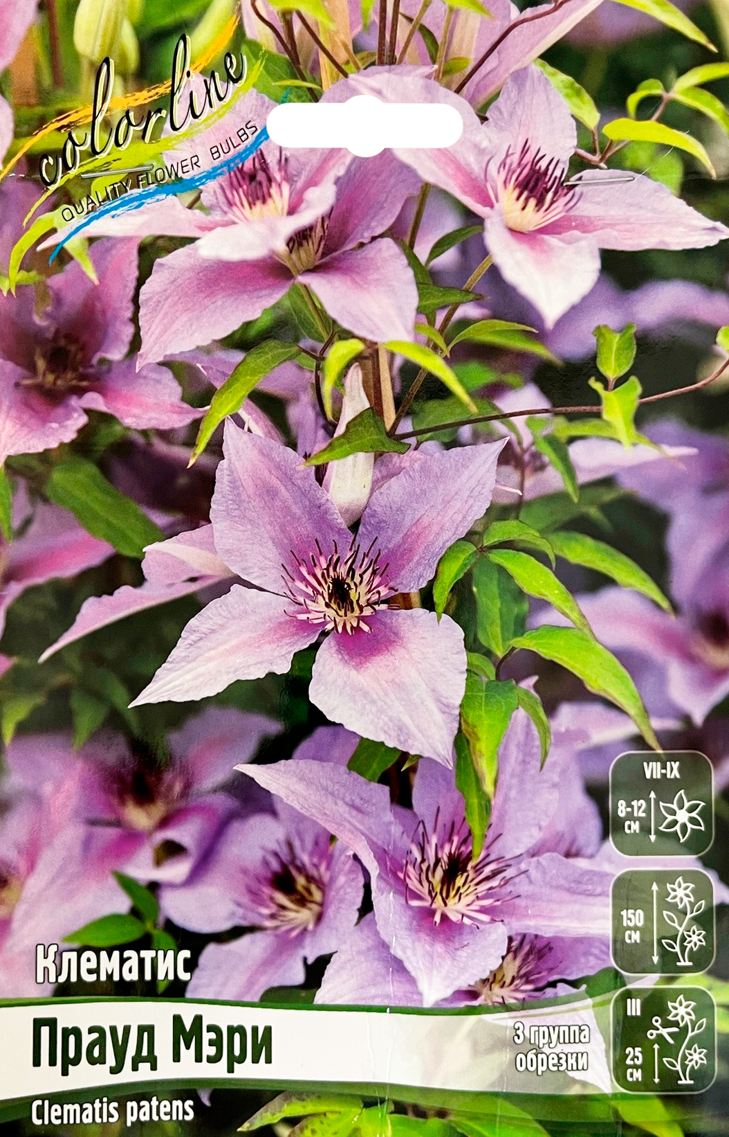 Клематис Прауд МэриКлематис Прауд Мари ( Proud Mary) - этот небольшой клематис (1,50 м) очень обильно цветет по всей высоте как на молодых побегах,