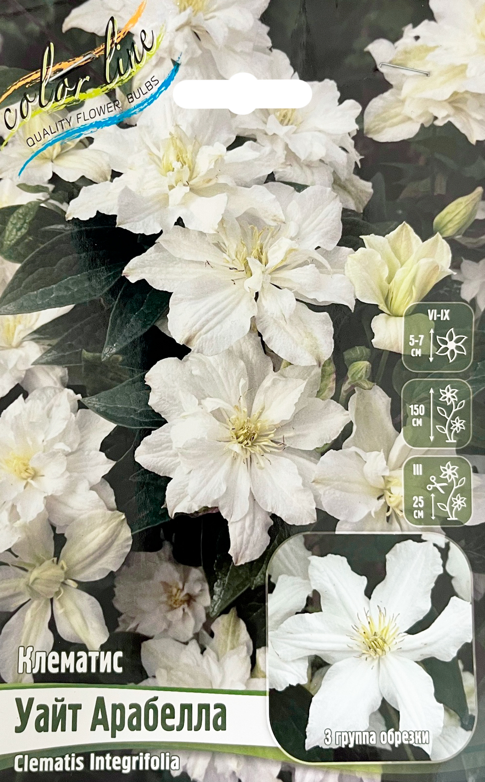 Клематис Уайт АрабеллаКлематис Вайт Арабелла относится к сортовой группе Интегрифолия, представляет собой компактный низкорослый куст высотой в 1-1,5 метра. Приподнятые побеги покрыты красивой листвой темно-зеленого цвета.