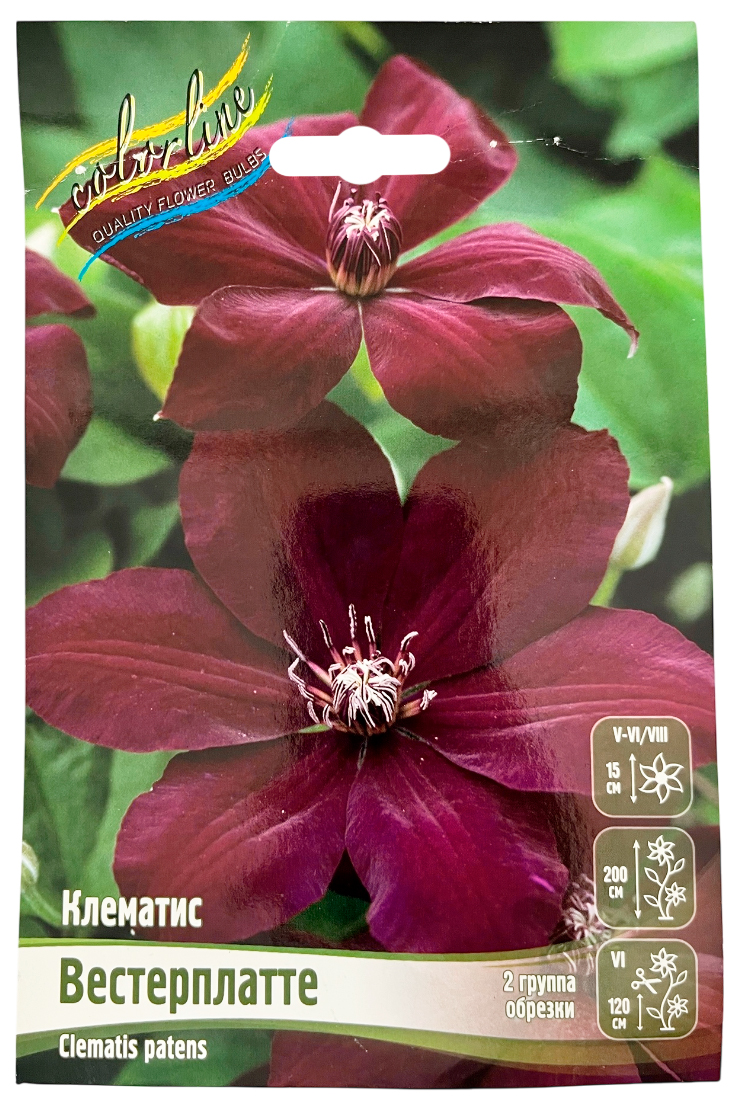 Клематис ВЕСТЕРПЛАТТЕ (2 группа обрезки)Отличный вариант для ценителей сочных красок и радужного цветочного колорита. Высокорослый клематис до 2х м. Интенсивный ядовито-гранатовый оттенок цветков придаёт колоритной живописности месту посадки растения. Чашелистики крупные, слегка волнятся на краях. Бархатистость и диаметр до 15 см цветка добавят роскоши в цветочную композицию.