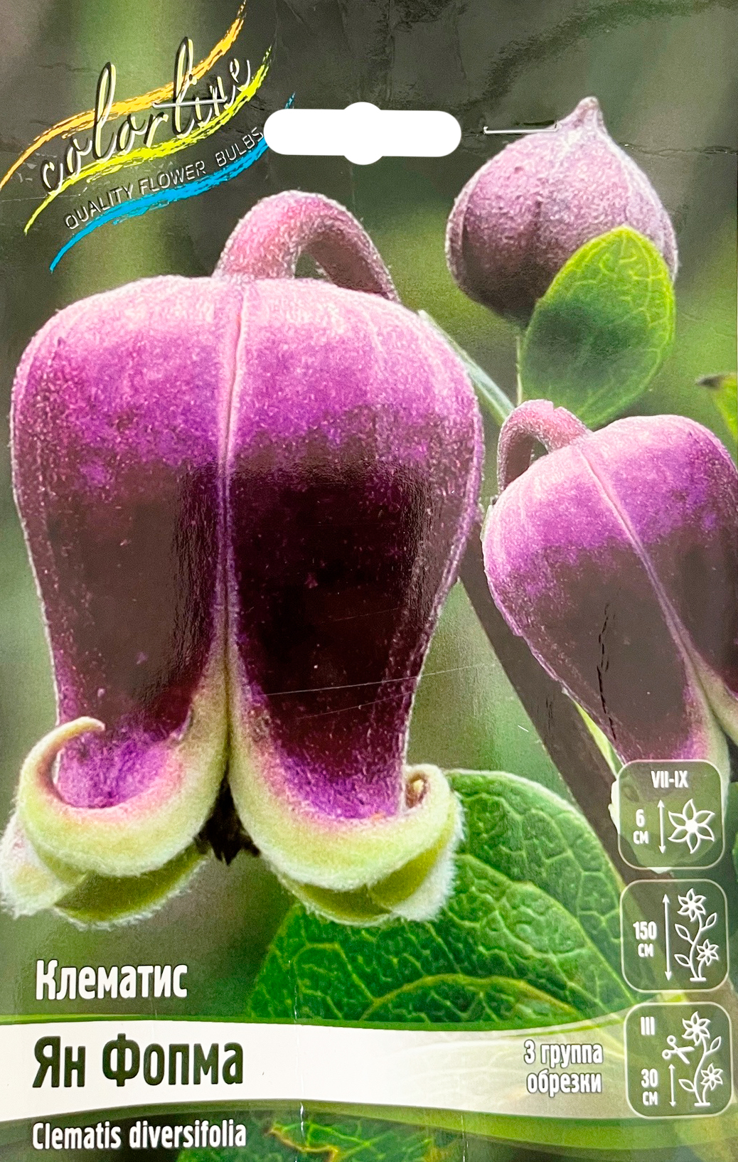Клематис Ян Фопма является одним из самых популярных сортов клематисов. Он очень быстро растет и создает плотное зеленое покрытие на небольших поверхностях. Этот сорт относится к низким и в высоту достигает 1-1,5 м. Его можно выращивать в больших контейнерах и использовать для срезки. Окраска его цветков сиренево-фиолетовая с пурпурным оттенком.