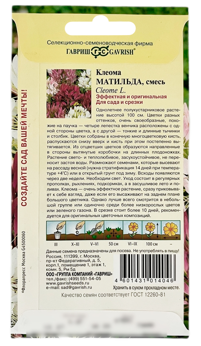 Клеома Матильда смесь ГАВРИШОднолетнее полукустарниковое растения высотой около 100 см. Цветки очень своеобразные, похожие на паучка - четыре лепестка венчика расположены с одной стороны цветка, а с другой - тонкие и длинные тычинки и столбик. Цветки собраны в конечную многоцветковую кисть, распускаются снизу вверх и кисть при этом постепенно вытягивается. Из отцветших цветков образуются направленные в стороны вытянутые коробочки на длинных плодоножках. Растение свето- и теплолюбивое, засухоустойчивое, не переносит застоя воды. Размножают семенами, которые высевают на рассаду весной (нужна стратификация при t 4°C) или в открытый грунт под зиму. Всходы появляются через две недели. Уход состоит в регулярных прополках, рыхлениях, подкормках, а в засушливое лето и поливах. Клеома-очень эффектное растение, сразу приковывает к себе взгляд, даже если его высаживают на заднем плане большого цветника. Однако лучше всего смотрится в небольшой группе или одиночно среди более низкорослых цветов или зеленого газона. В срезке стоит более 10 дней, рекомендуется для оригинальных цветочных композиций.