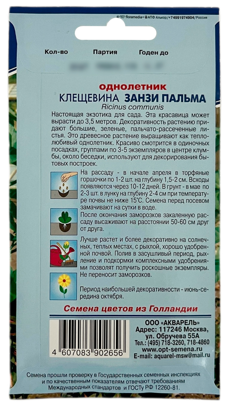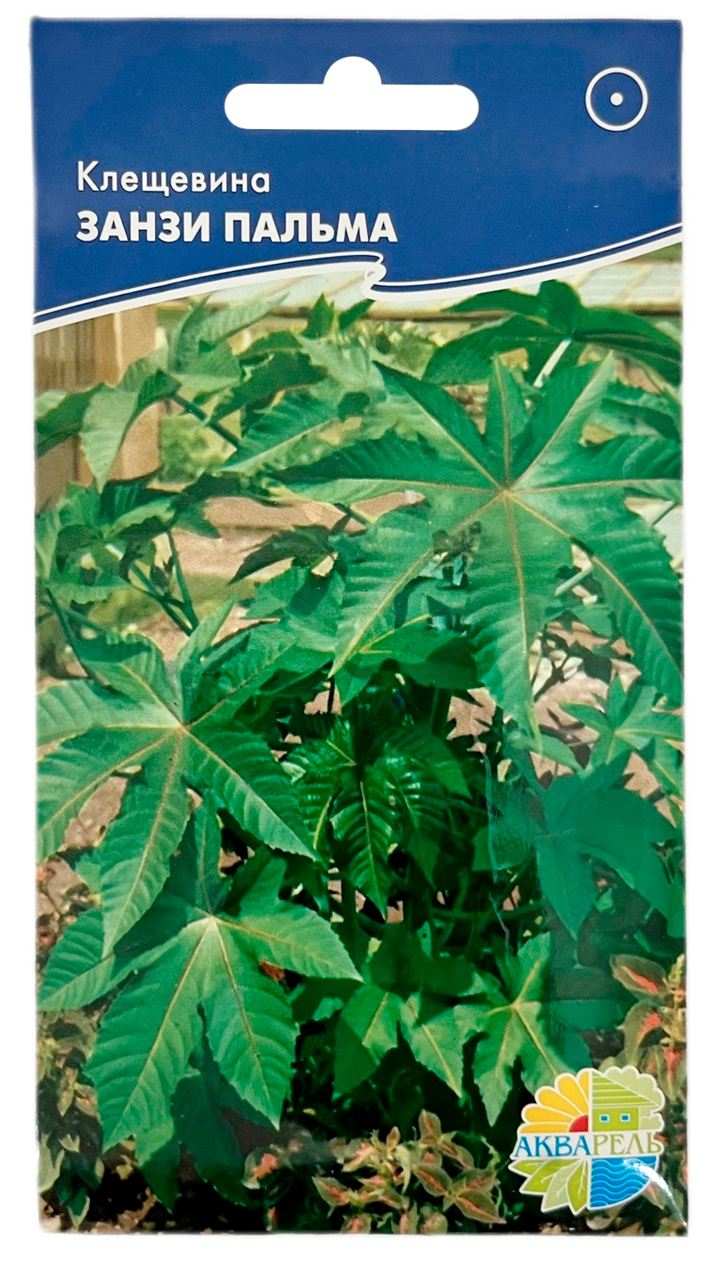 Клещевина ЗАНЗИ ПАЛЬМА АКВАРЕЛЬНастоящая экзотика для сада. Эта красавица может вырасти до 3,5 метров. Декоративность растению придают большие, зеленые пальчато-рассеченные листья. Это древесное растение выращивают как теплолюбивый однолетник. Красиво смотрится в одиночных посадках, группами по 3-5 экземпляров в центре клумбы, около беседки, используют для декорирования бытовых построек.