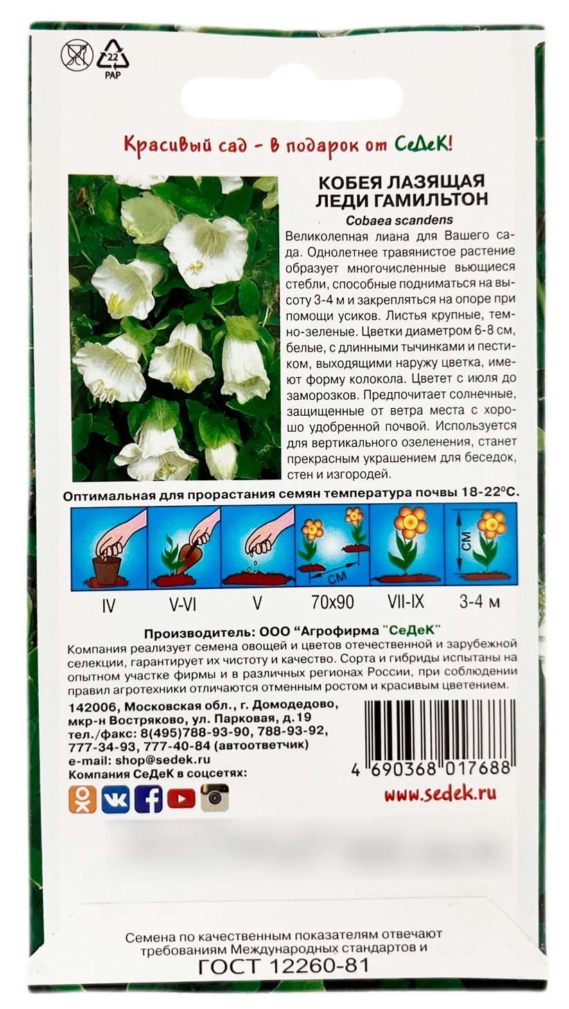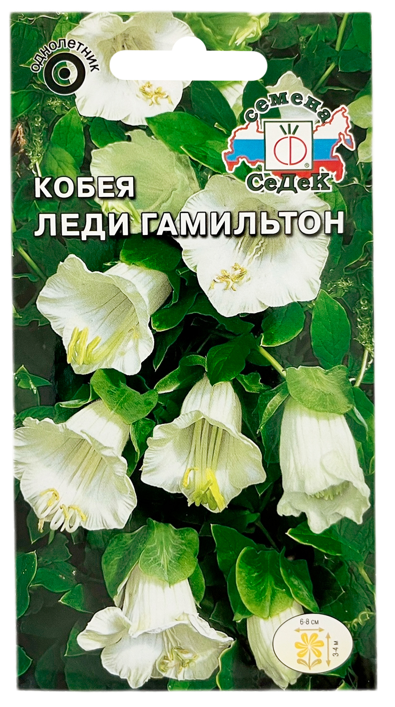 Кобея лазящая ЛЕДИ ГАМИЛЬТОН СеДеКВеликолепная лиана для Вашего сада. Однолетнее травянистое растение образует многочисленные вьющиеся стебли, способные подниматься на высоту 3-4 м и закрепляться на опоре при помощи усиков. Листья крупные, темно-зеленые. Цветки диаметром 6-8 см, белые, с длинными тычинками и пестиком, выходящими наружу цветка, имеют форму колокола. Цветет c июля до заморозков. Предпочитает солнечные, защищенные от ветра места с хорошо удобренной почвой. Используется для вертикального озеленения, станет прекрасным украшением для беседок, стен и изгородей.