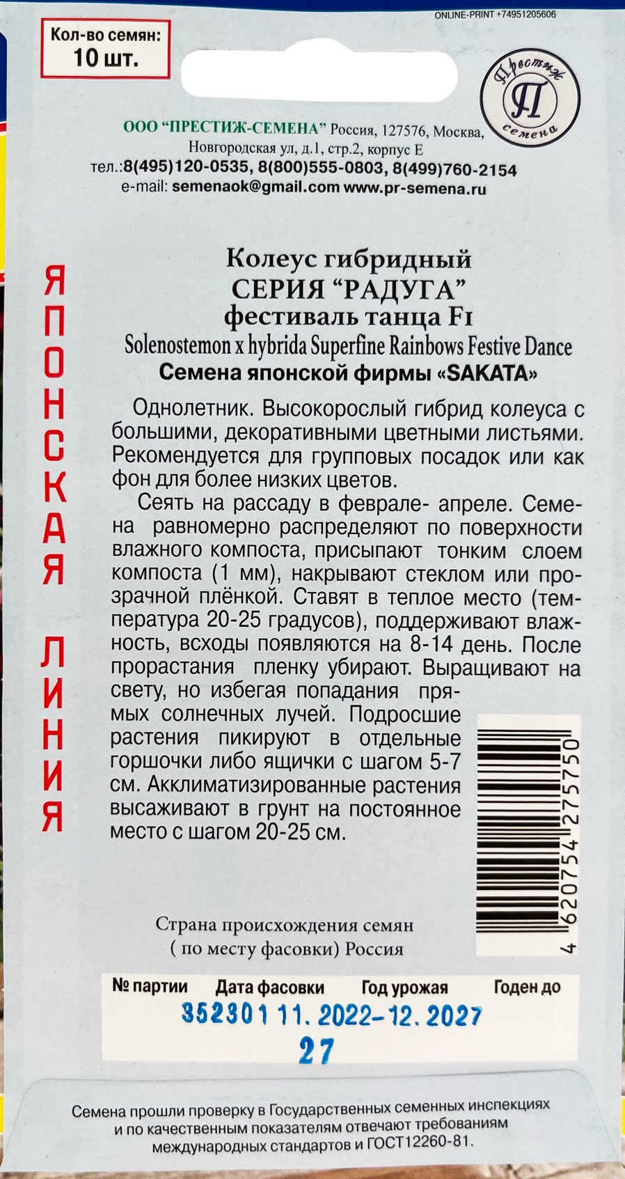 Колеус Радуга Фестиваль танцаОднолетник. Высокорослый гибрид колеуса с большими, декоративными цветными листьями. Рекомендуется для групповых посадок или как фон для более низких цветов.Сеять на рассаду в феврале-апреле. Семена равномерно распределяют по поверхности влажного компоста, присыпают тонким слоем компоста (1 мм), накрывают стеклом или прозрачной плёнкой. Ставят в теплое место (температура 20-25 градусов), поддерживают влажность, всходы появляются на 8-14 день. После прорастания пленку убирают. Выращивают на свету, но избегая попадания прямых солнечных лучей. Подросшие растения пикируют в отдельные горшочки либо ящички с шагом 5-7 см. Акклиматизированные растения высаживают в грунт на постоянное место с шагом 20-25 см.