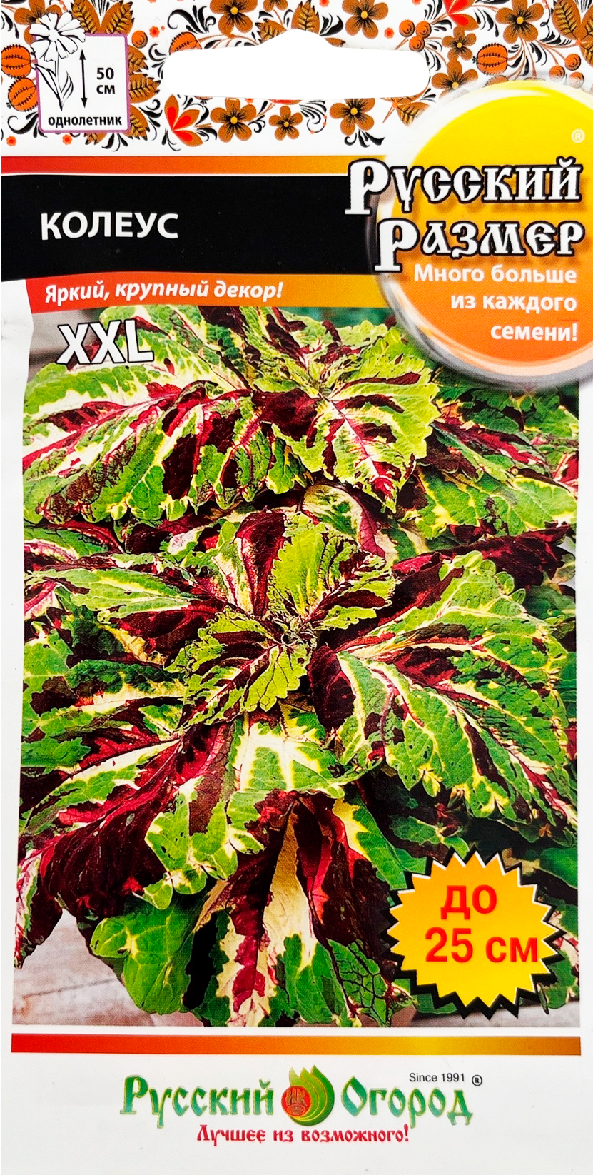 Колеус Русский размер 4штКолеус Русский размер – выдающееся растение семейства Яснотковые, для сада и приусадебного участка. Отлично развивается и в закрытых помещениях, как комнатное растение, достойно вписывается в любой растительный ансамбль. Колеус известен и популярен среди садоводов не своими цветками, а своими листьями. Как это ни странно, но цветы Колеуса мало примечательны. А вот своей вегетативной массой, если называть ее научно, а по-простому – листвой – это растение и выделяется. Листья у Колеуса довольно крупные и очень яркие по цвету. Величина некоторых из них может превышать 15 сантиметров. Многие цветоводы предпочитают высаживать в одном месте сразу несколько сортов этого растения, чтобы создать необычную композицию из превосходных листьев и разнообразить свой участок, украсив его не только цветочными растениями, но и красивой листвой Колеуса. С биологической точки зрения одно растение Колеуса сорта Русский размер - это один прямостоячий стебель, с бархатистыми листьями насыщенного окраса. Поэтому если Вы хотите добиться особой пышности, следует одновременно высаживать по нескольку растений, чтобы создать искусственный куст. Цветы Колеусу не нужны. Благодаря их появлению, растение отдаёт огромную часть жизненного потенциала именно им, забирая его от эффектных листьев, поэтому при появлении цветоносов их рекомендуется сразу же удалять.