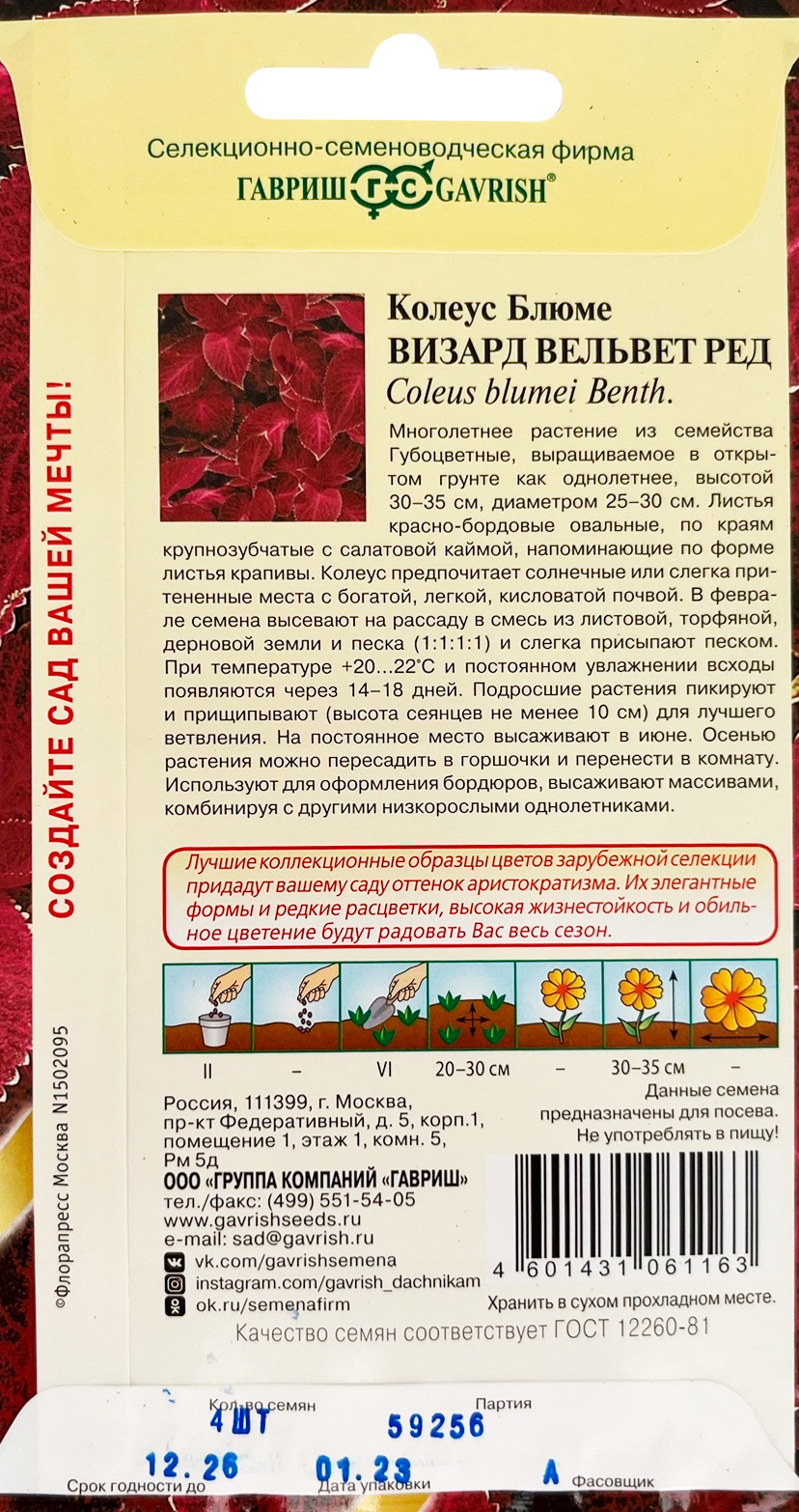 Колеус Визард Вельвет ред* 4 шт. Элитная клумбаМноголетнее растение из семейства Губоцветные, выращиваемое в открытом грунте как однолетнее. Компактный кустик, высотой 30-35 см, диаметром 25-30 см. Листья красно-бордовые овальные, по краям крупнозубчатые с салатовой каймой, напоминающие по форме листья крапивы. Колеус предпочитает солнечные или слегка притененные места с богатой, легкой, кисловатой почвой. В феврале семена высевают на рассаду в смесь из листовой, торфяной, дерновой земли и песка (1:1:1:1) и слегка присыпают песком. При температуре 20-22°С и постоянном увлажнении всходы появляются через 14-18 дней. Подросшие растения пикируют и прищипывают (высота сеянцев не менее 10 см) для лучшего ветвления. На постоянное место высаживают в июне. Осенью растения можно пересадить в горшочки и перенести в комнату. Используют для оформления бордюров, высаживают массивами, комбинируя с другими низкорослыми однолетниками.