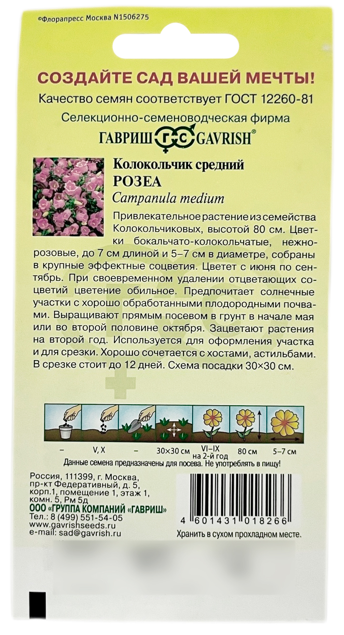 Колокольчик средний РОЗЕА ГАВРИШПривлекательное растение из семейства Колокольчиковых высотой 80 см. Цветки бокальчато-колокольчатые, розового цвета, до 7 см длиной и 5-7 см в диаметре, собраны в крупные эффектные соцветия. Цветет с июня по сентябрь. При своевременном удалении отцветающих соцветий цветение - обильное. Предпочитает солнечные участки с хорошо обработанными плодородными почвами. Выращивают прямым посевом в грунт в начале мая или во второй половине октября. Зацветают растения на второй год. Используется для оформления участка и для срезки. Хорошо сочетается с хостами, астильбами. В срезке стоит до 12 дней. Схема посадки 30х30 см.