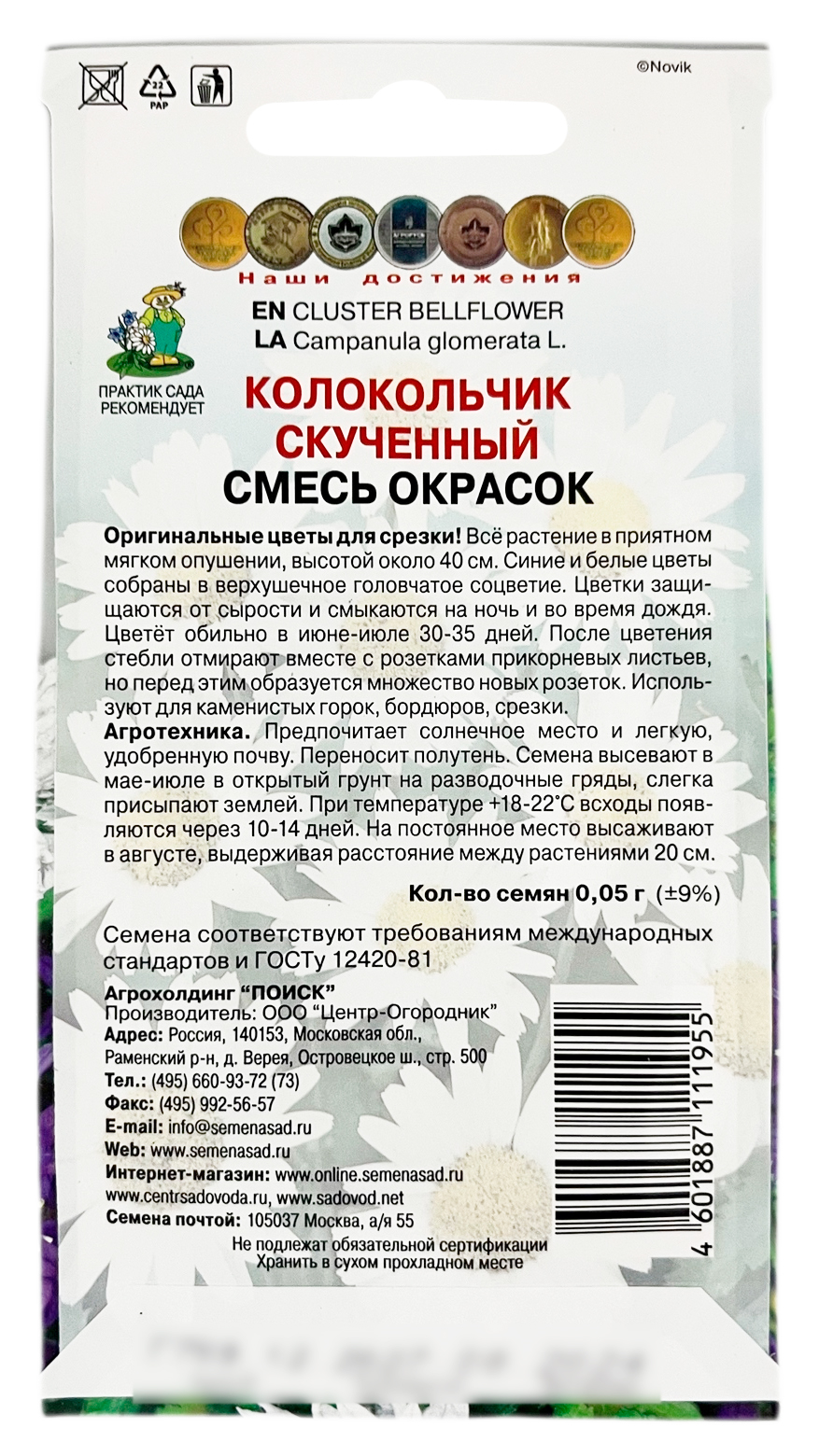 Колокольчик СКУЧЕННЫЙ смесь окрасок ПОИСКОригинальные цветы для срезки! Всё растение в приятном мягком опушении, высотой около 40 см.Синие и белые цветы собраны в верхушечное головчатое соцветие. Цветки защищаются от сырости и смыкаются на ночь и во время дождя. Цветет обильно в июне-июле 30-35 дней. После цветения стебли отмирают вместе с розетками прикорневых листьев, но перед этим образуется множество новых розеток. Используют для каменистых горок, бордюров, срезки.