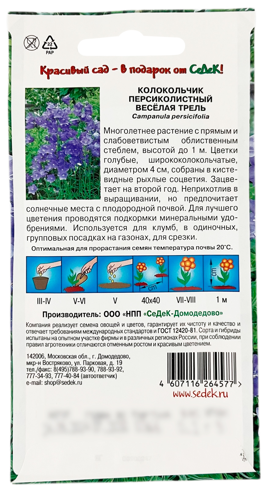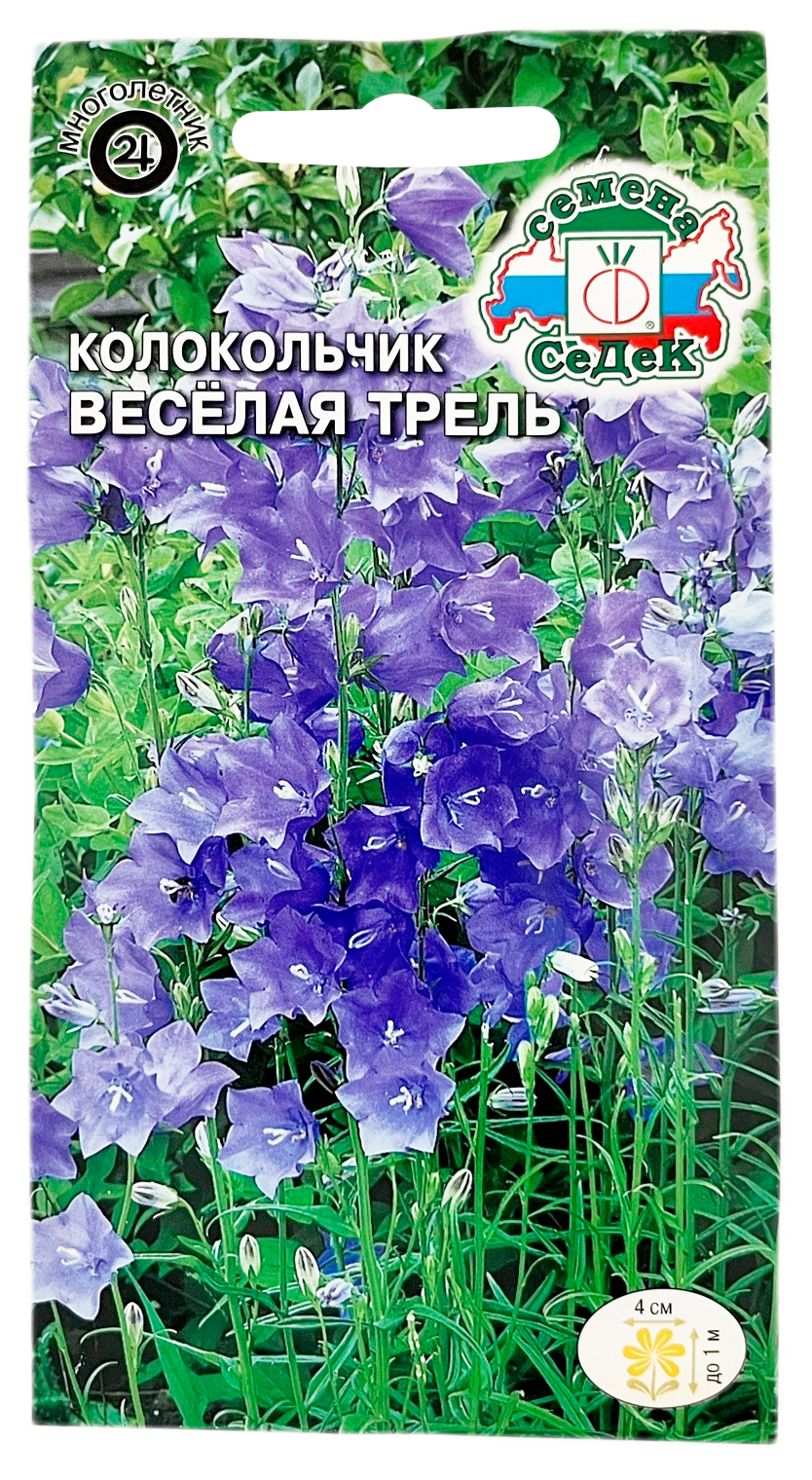 Колокольчик персиколистный ВЕСЁЛАЯ ТРЕЛЬ СеДеКЭтот великолепный многолетник выращивают в садах веками. Растение изящное, формирует розетку листьев и многочисленные цветоносы. Голубые цветки собраны в кистевидные соцветия. Предпочитает солнечные места с плодородной, известкованной, увлажненной (без застоя воды) почвой. Используют для клумб, одиночных, групповых посадок на газонах, для срезки. Зацветает на второй год.