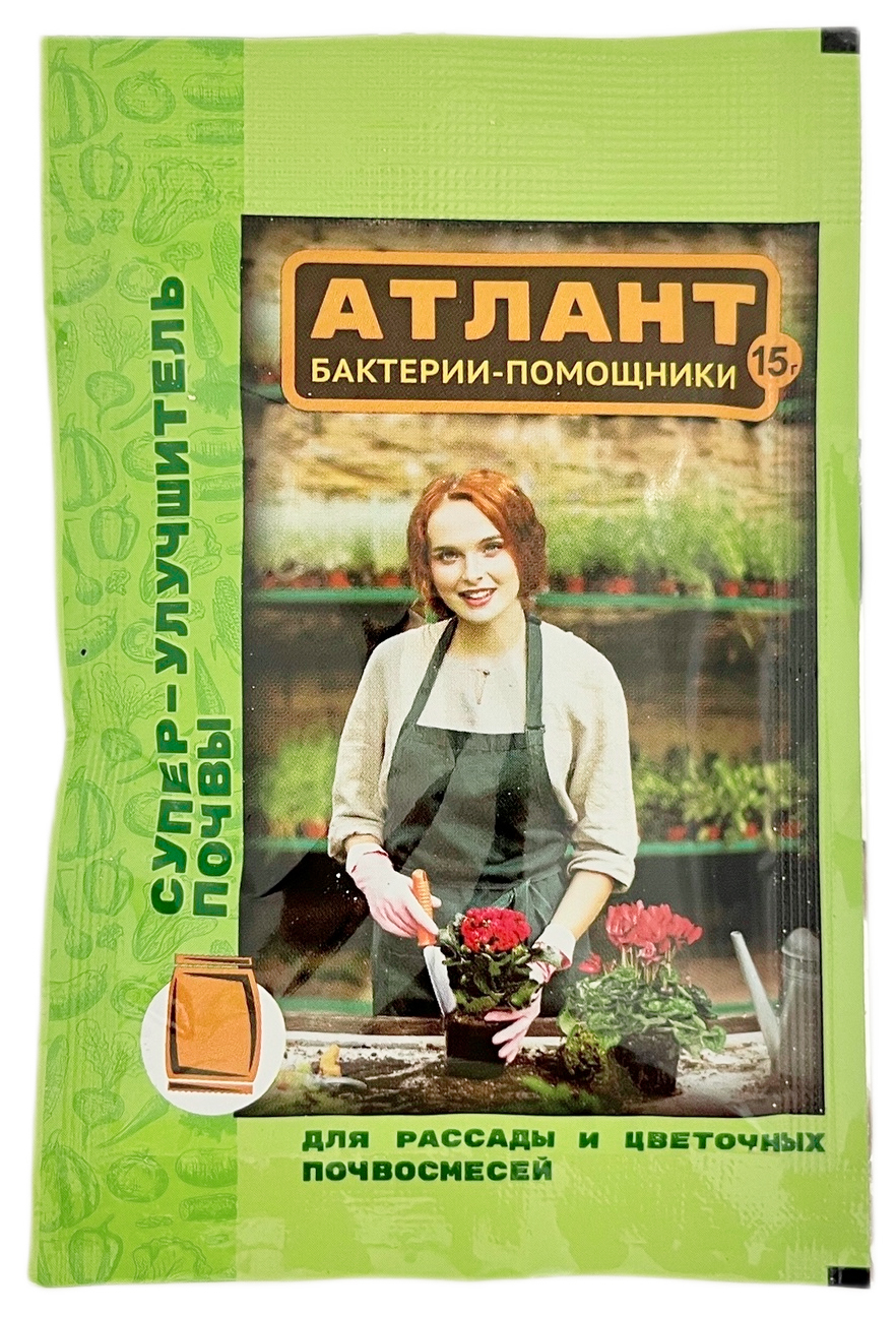 Атлант бактерии-помощники. СУПЕР–УЛУЧШИТЕЛЬ ПОЧВЫ для рассады и цветочных почвосмесей.«АТЛАНТ» — «СУПЕР–улучшитель почвы» это принципиально новый биокомплекс, в котором все формы микроорганизмов работают последовательно и не угнетают друг друга.