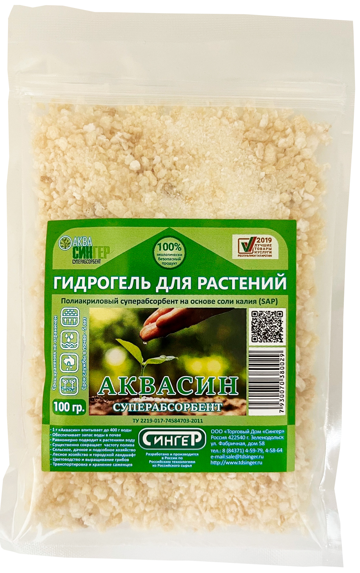 Гидрогель порошок для грунта Аквасин МК 100гГидрогель "Аквасин"- первая отечественная разработка продукта подобного качества и первое производство на территории России. Не уступает, а в ряде показателей превосходит зарубежные аналоги. На 1 грамм гидрогеля адсорбируется до 300-400 мл.воды, что превышает собственную массу препарата.