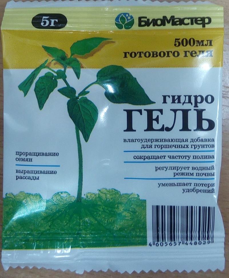 Структурирующая, влагоудерживающая добавка к почвогрунтам обеспечивающая оптимальный воздушный и водный режимы.Гранула геля способна поглотить количество воды в 200 раз больше собственной массы. Набухшие гранулы являются резервуаром воды, питательных элементов и удобрений, откуда они потребляются растениями по мере необходимости. При потреблении воды растением, гранула геля обезвоживается и возвращается к своему исходному размеру, до момента появления воды доступной для поглощения. Возможность набухать и сжиматься в почве сохраняется более 5 лет, после чего гель распадается с выделением углекислого газа, аммония и воды, без выделения каких-либо токсичных продуктов. Гель можно использовать многократно. Применяется как среда для предохранения открытой корневой системы при транспортировке и длительном хранении черенков. При применении геля можно сократить частоту поливов от 2 до 5 раз, что актуально для случаев нерегулярного ухода за растениями.