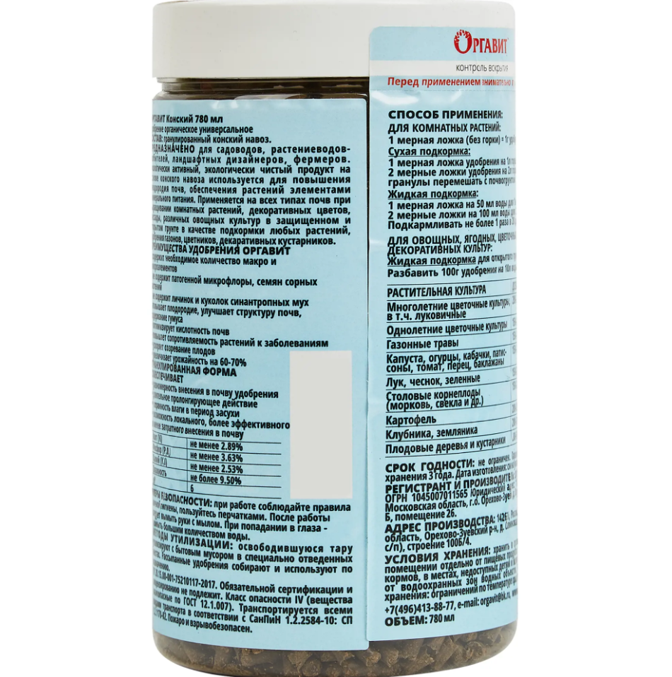 Удобрение Оргавит Конский навоз 780млГранулированный конский навоз Оргавит, обладает огромным количеством полезных веществ для культурных насаждений и считается лучшим удобрением для истощенной ежегодными посадками растений почвы. Предназначен для комнатных растений, овощных, ягодных, цветочных культур, плодовых и декоративных культур При пересадке стимулирует быстрое восстановление корневой системы, благодаря чему растение легче адаптируется к новым условиям, повышается стрессоустойчивость.