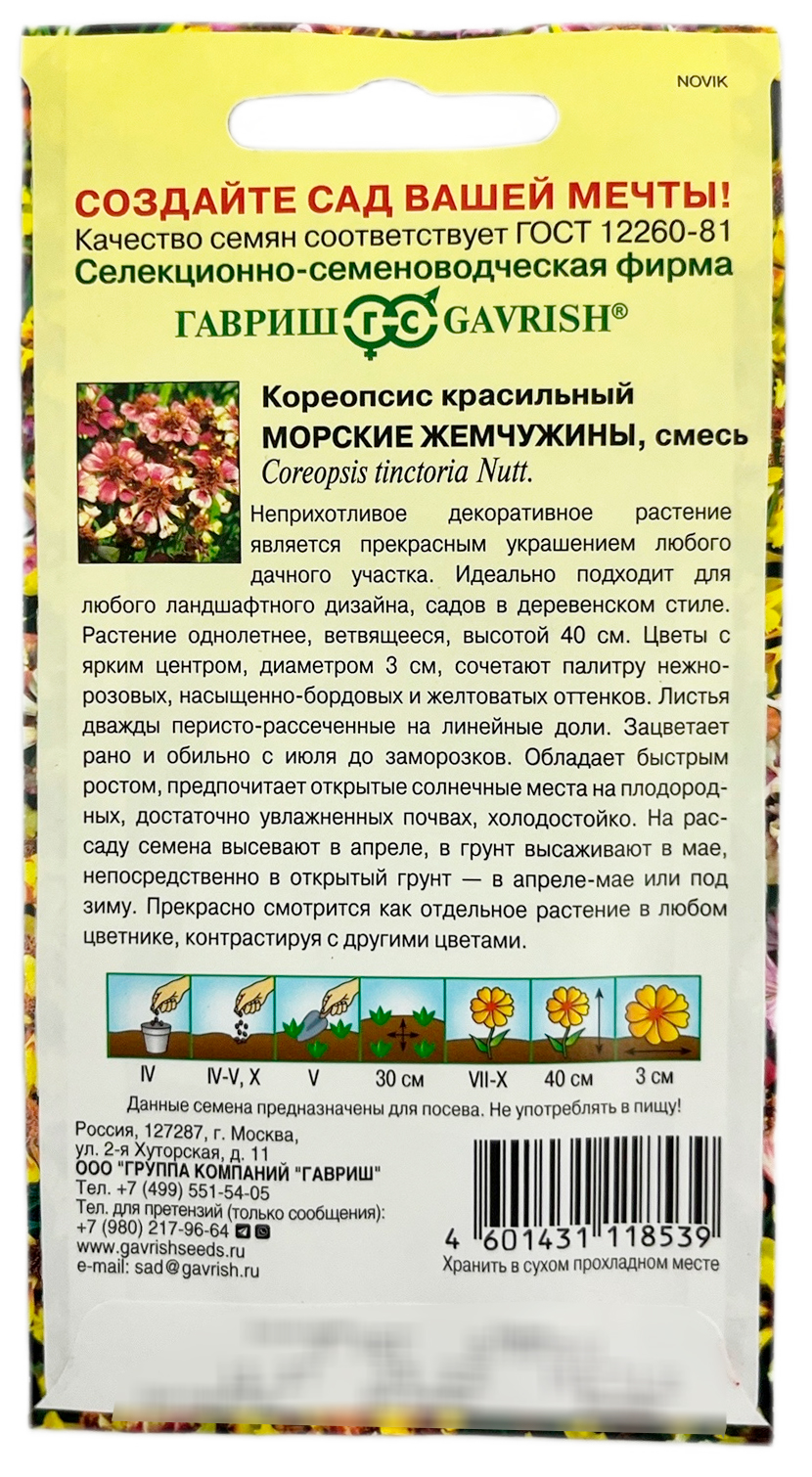 Кореопсис красильный Морские жемчужины смесь ГАВРИШНеприхотливое декоративное растение является прекрасным украшением любого дачного участка. Идеально подходит для любого ландшафтного дизайна, садов в деревенском стиле. Растение однолетнее ветвящиеся высотой 40 см. Цветы диаметром 3 см сочетают палитру нежно розовых, насыщенно бордовых и желтоватых оттенков, с ярким центром. Листья дважды перисто-рассеченные на линейные доли. Зацветает рано и обильно с июля до заморозков. Обладает быстрым ростом, предпочитает открытые солнечные места на плодородных, достаточно увлажненных почвах, холодостойко. На рассаду семена высевают в апреле, в грунт высаживают в мае, непосредственно в открытый грунт — в апреле-мае или под зиму. Прекрасно смотрится как отдельное растение в любом цветнике, контрастируя с другими цветами.