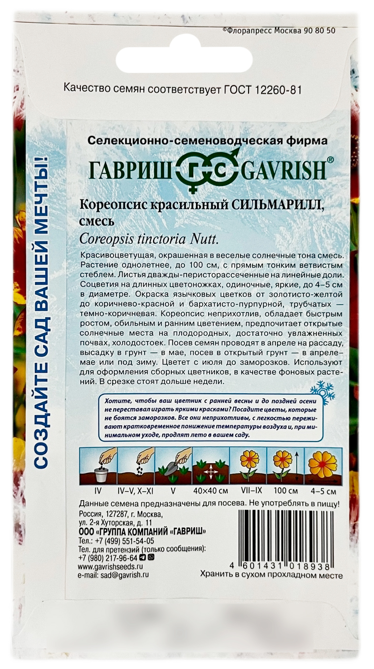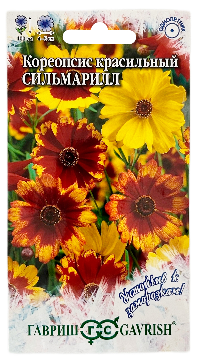 Кореопсис красильный СИЛЬМАРИЛЛ смесь ГАВРИШКрасивоцветущая, окрашенная в веселые солнечные тона, смесь. Растение однолетнее, с прямым тонким ветвистым стеблем. Листья дважды-перисторассеченные на линейные доли. Соцветия на длинных цветоножках, одиночные, яркие, до 4-5 см в диаметре. Окраска язычковых цветков от золотисто-желтой до коричнево-красной и бархатисто-пурпурной, трубчатых – темно-коричневая. Корепсисы неприхотливы, обладают быстрым ростом, обильным и ранним цветением, предпочитают открытые солнечные места на плодородных, достаточно увлажненных почвах, холодостойки. Посев семян проводят в апреле на рассаду, высадку в грунт в мае, посев в открытый грунт – в апреле-мае или под зиму. Цветет с июля до заморозков. Используют для оформления сборных цветников, в качестве фоновых растений. В срезке стоят дольше недели.