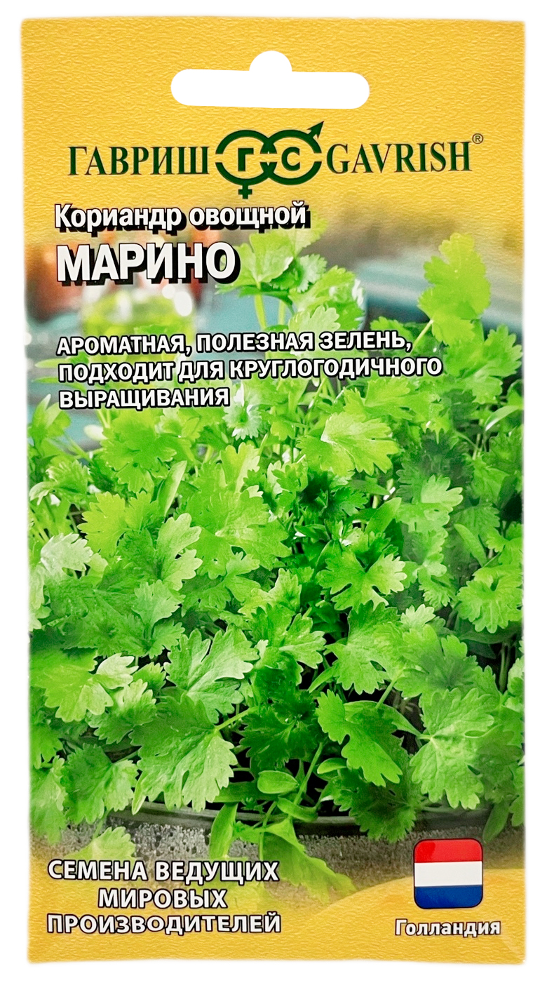 Кориандр овощной МАРИНО ГАВРИШПопулярная приправа обладает пикантным терпким ароматом, придает блюдам изысканный вкус, содержит много витаминов, микроэлементов и полезных эфирных масел. Растение полупрямостоячие, ветвление слабое. Период от полных всходов до начала сбора на зелень 40-45 дней. Листья темно-зеленые, крупные, среднерассеченные. Обладают нежным ароматом. Цветки белые. Масса одного растения 25-26 г. Рекомендуется для употребления в свежем виде (листья, молодые побеги) и в качестве пряной приправы (сушеные листья, зрелые семена). Антоциановая окраска зонтика отсутствует. Сорт холодостоек, устойчив к стрелкованию, толерантен к повышенным температурам. В защищенном грунте пригоден для всесезонного выращивания. Урожайность зелени 1,6 кг/м2.