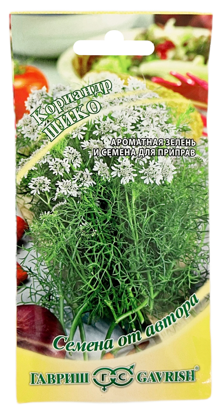 Кориандр ШИКО ГАВРИШОднолетнее холодостойкое растение. Сорт среднеспелый (30-50 дней от всходов до уборки зелени). Листовая розетка полураскидистая. Листья темно-зеленые, нежные, черешки светло-зеленые. Семена начинают прорастать при 60С. Их высевают рано весной по схеме 10х20-30 см. Для непрерывного поступления зелени посевы повторяют каждые 2-3 недели. Растения имеют своеобразный сильный запах. Листья молодых растений используют в кулинарии. Семена добавляют как пряную приправу для ароматизации хлеба, кондитерских изделий и в маринады. В медицине используют при простудных и желудочных заболеваниях, обладает желчегонным, болеутоляющим и ранозаживляющим свойствами. Отличный медонос.