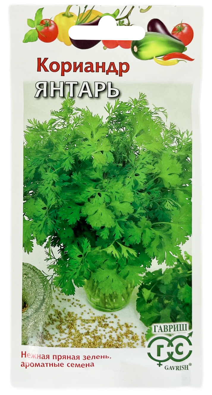 Кориандр ЯНТАРЬ ГАВРИШОднолетнее холодостойкое растение. Сорт среднеспелый (30-50 дней от всходов до уборки зелени). Листовая розетка полураскидистая. Листья темно-зеленые, нежные, ароматные. Выращивают прямым посевом в открытый грунт. Для непрерывного поступления зелени посевы повторяют каждые 2-3 недели. Листья молодых растений используют в кулинарии. Семена добавляют как пряную приправу для ароматизации хлеба, кондитерских изделий и в маринады. В медицине используют при простудных и желудочных заболеваниях, обладает желчегонным, болеутоляющим и ранозаживляющим свойствами. Отличный медонос.
