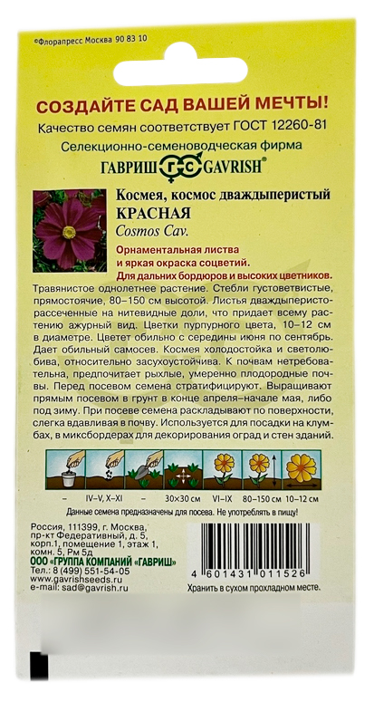 Космея космос дваждыперистый КРАСНАЯ ГАВРИШТравянистое однолетнее растение. Стебли густоветвистые, прямостоячие, 80-150 см высотой. Листья дважды перисто-рассеченные на нитевидные доли, что придает всему растению ажурный вид. Цветки красного цвета 10-12 см в диаметре. Цветет обильно с середины июня по сентябрь. Дает обильный самосев. Холодостойка и светолюбива, относительно засухоустойчива. К почвам нетребовательна, предпочитает рыхлые, умеренно плодородные почвы. Выращивают прямым посевом в грунт в конце апреля-начале мая, либо под зиму. Используется для посадки на клумбах, в миксбордерах для декорирования оград и стен зданий.