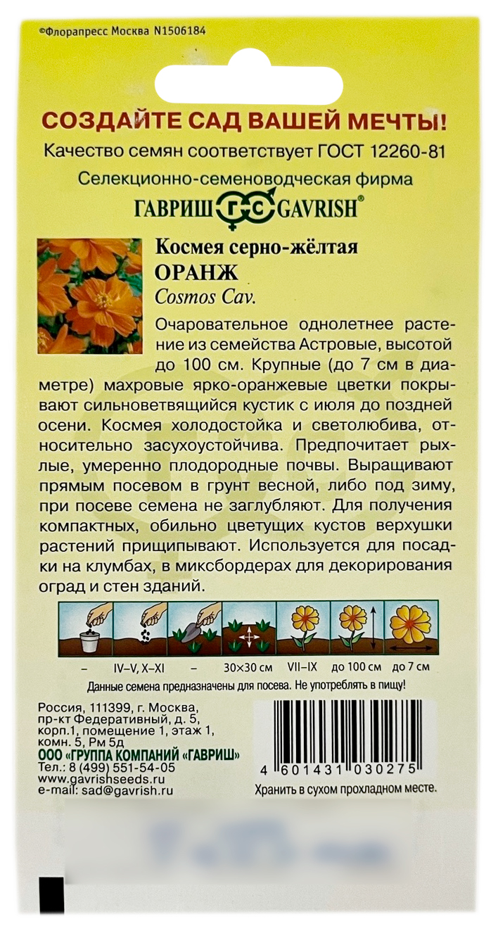 Космея серно-жёлтая ОРАНЖ ГАВРИШОчаровательное однолетнее растение из семейства Астровые, высотой до 100 см. Крупные (до 7 см в диаметре), махровые, ярко-оранжевые цветки, покрывают сильноветвящийся кустик с июля до поздней осени. Космея холодостойка и светолюбива, относительно засухоустойчива. Предпочитает рыхлые, умеренно плодородные почвы. Выращивают прямым посевом в грунт весной, либо под зиму. Для получения компактных, обильно цветущих кустов верхушки растений прищипывают. Используется для посадки на клумбах, в миксбордерах для декорирования оград и стен зданий.