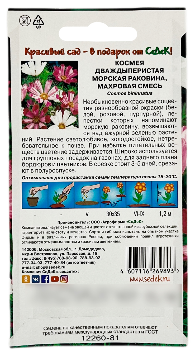 Космея дваждыперистая МОРСКАЯ РАКОВИНА махровая смесь СеДеКНеобыкновенно красивые соцветия разнообразной окраски (белой, розовой., пурпурной), лепестки которых напоминают морскую раковину, возвышаются над ажурной зеленью растений. Светолюбивое, холодостойкое, нетребовательное к почве растение. При избытке питательных веществ цветение задерживается. Широко используется для групповых посадок на газонах, для заднего плана бордюров и цветников. В срезке стоит 3-5 дней, срезают в полуроспуске.