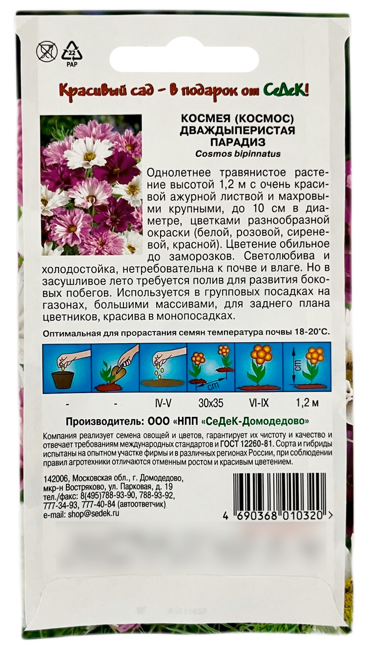 Космея КОСМОС дваждыперистая ПАРАДИЗ СеДеКОднолетнее травянистое растение, высотой 1,2 м, с очень красивой ажурной листвой и махровыми, крупными, до 10 см в диаметре, цветками разнообразной окраски (белой, розовой, сиреневой, красной). Цветение обильное до заморозков. Светолюбива и холодостойка, нетребовательна к почве и влаге. Но в засушливое лето требуется полив для развития боковых побегов. Используется для групповых посадках на газонах, большими массивами, для заднего плана цветников, красив в монопасадках.