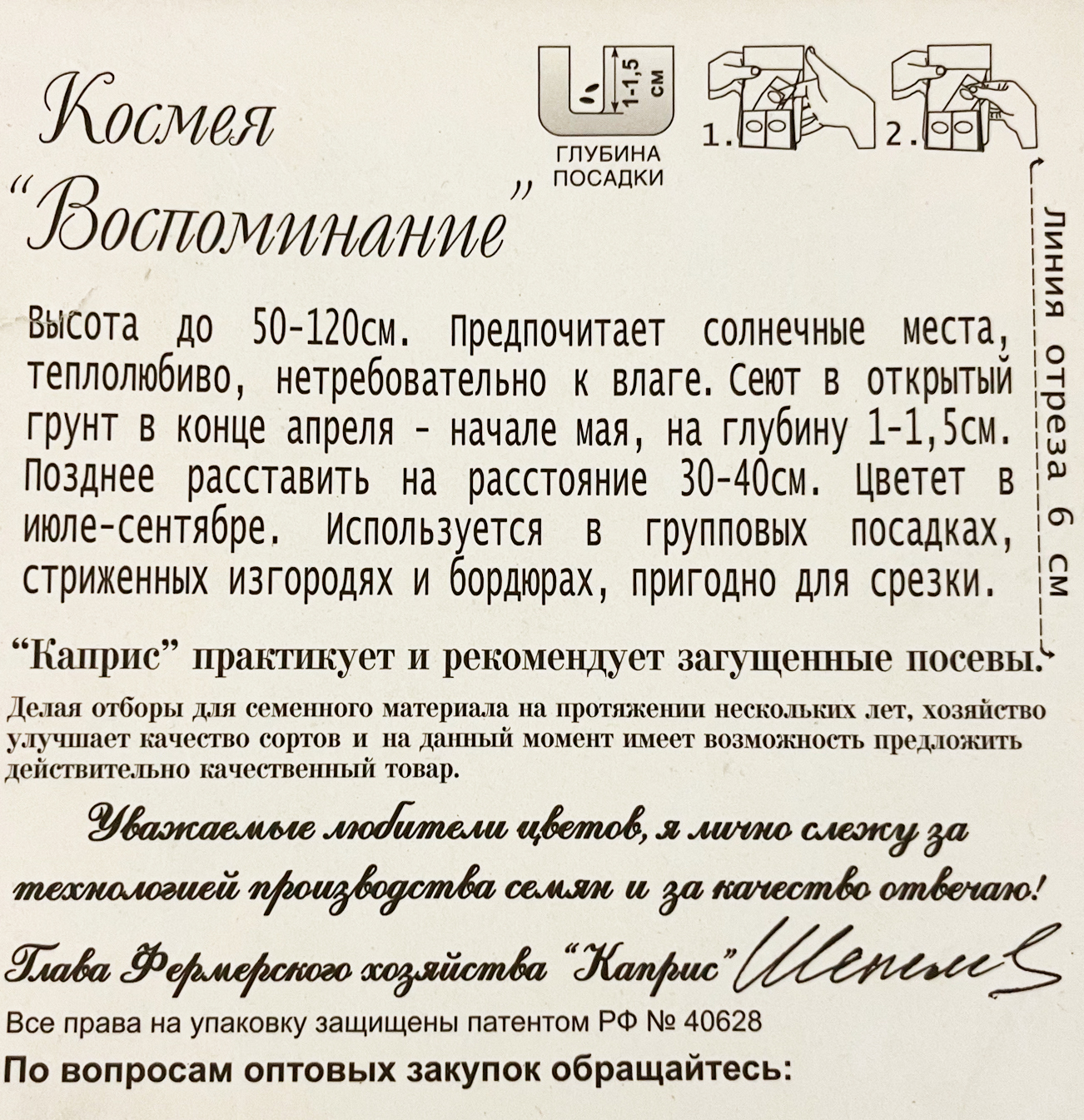 Космея Воспоминание смесьВысота до 50-120см, предпочитает солнечные места, теплолюбиво, нетребовательно к влаге. Сеют в конце апреля-начале мая на глубину 1-1,5см. Позднее рассадить на расстояние 30-40см. Цветет в июле-сентябре. Используется в групповых посадках, стриженных изгородях и бордюрах. Пригодно для срезки.