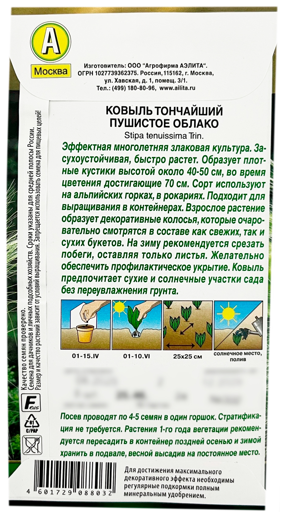 Ковыль тончайший ПУШИСТОЕ ОБЛАКО АЭЛИТАКовыль ПУШИСТОЕ ОБЛАКО – быстрорастущий злаковый многолетник 40 см высотой. Растение формирует аккуратный, компактный дернистый куст, декоративный в течение всего сезона. Красивейшие серебристые колоски, струящиеся на ветру – зрелище незабываемое. Идеальное растение для цветников природного стиля: альпинариев, гравийных садов, натургарденов. Пригоден для выращивания в контейнерах. Отлично компонуется с другими декоративными злаками, «дружит» с ирисами, молочаями, эхинацеей, однолетними хризантемами и эшшольцией. Оригинальные колосья ковыля придают несравненный шарм букетам и композициям, в том числе и из сухоцветов.