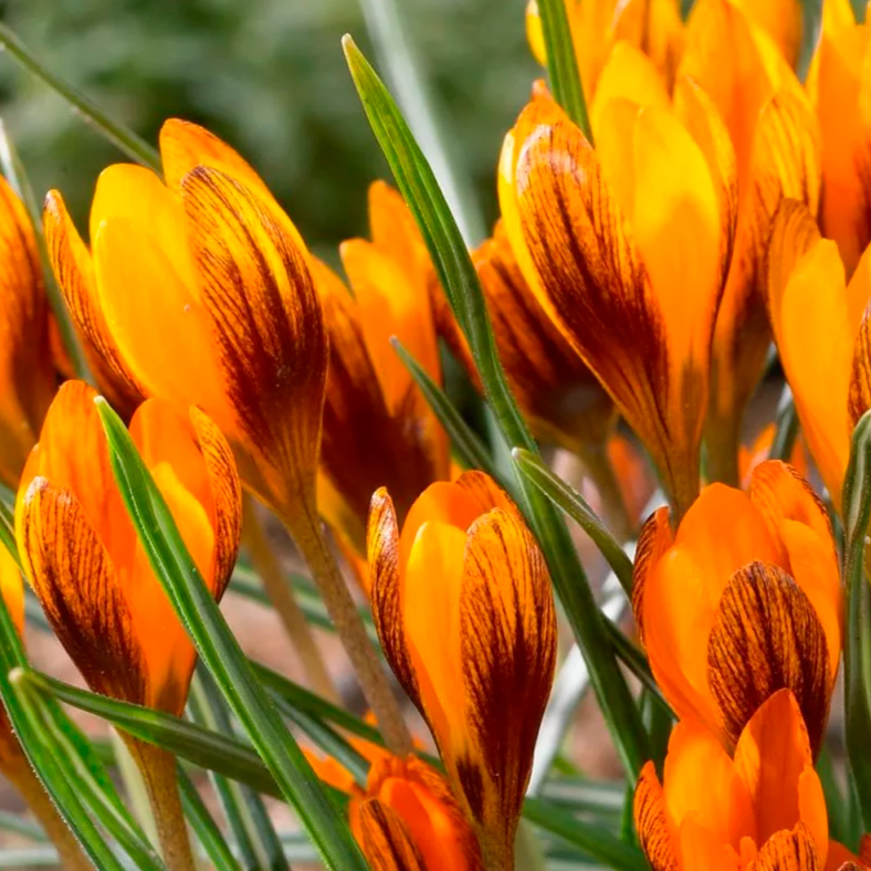 Крокус Оранж МонархРасцветает сразу, как только сойдет снег, цветет 2 недели. Бутоны изящные, огненно-оранжевые с темно-бордовыми мазками по внешней стороне лепестков, аромат приятный. Стебли прямые, высотой 8-10 см, листочки нежные, зеленые с белой прожилкой. Цветы неприхотливые, могут расти на каменистых почвах, но любят солнечные и безветренные места.