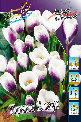 Крокус Принс Клаус белый, снаружи овальные голубые пятнаХарактеристики