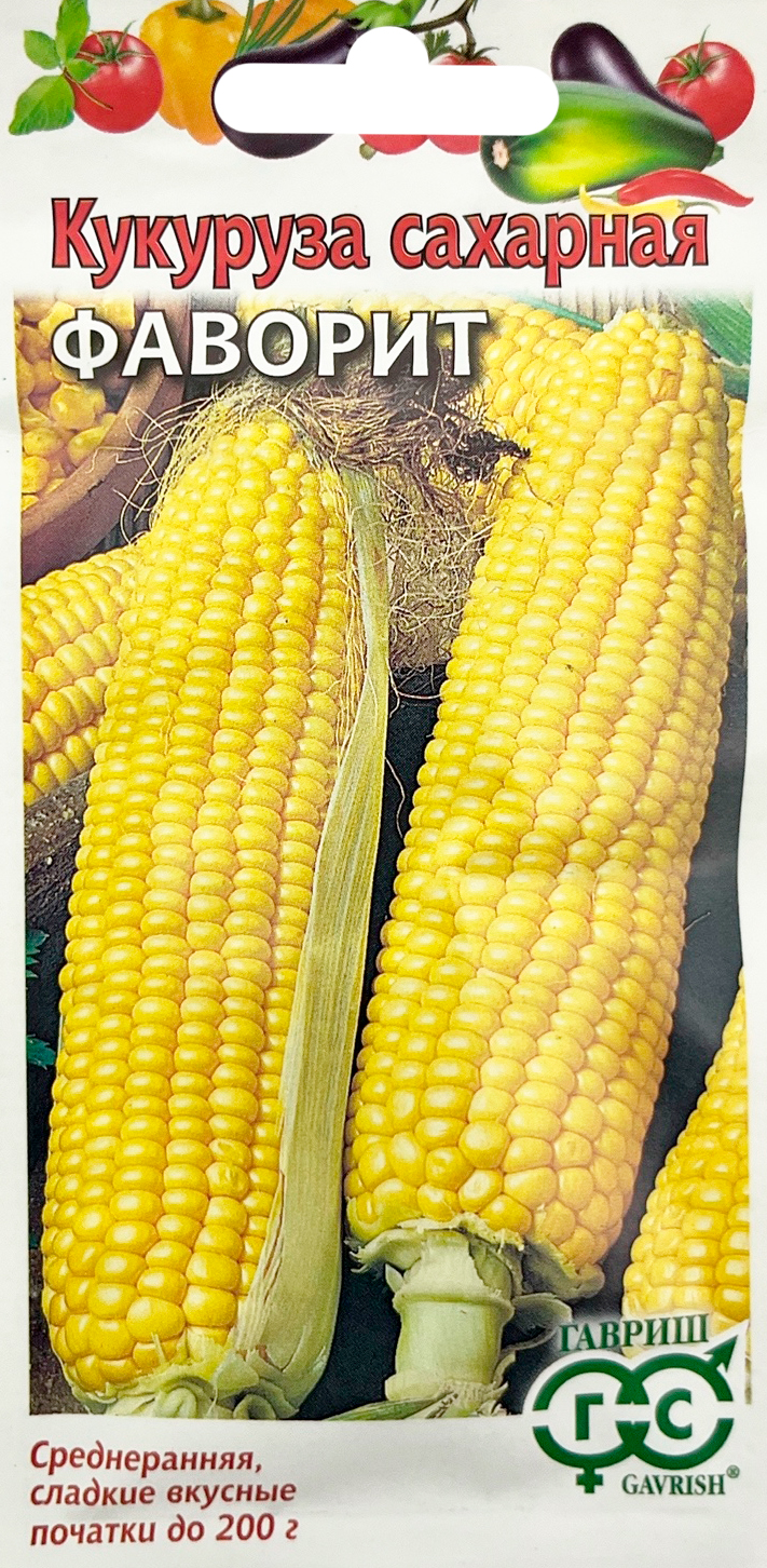 Кукуруза Фаворит сахарнаяСреднеранний (от всходов до технической спелости 75-79 дней) гибрид. Растение среднерослое, высотой 166-175 см, хорошо облиственное. Початки крупные, цилиндрической формы, 18 – 19 см длиной, диаметром 4,5 см, массой 200 г. Зерно сахарное, желтое, удлиненное, в фазу молочной спелости очень вкусное. Рекомендуется для употребления в отварном виде, для консервирования и заморозки. Кукуруза предпочитает легкие, плодородные, хорошо увлажненные почвы. Посев в грунт производят в мае на глубину 3-5 см. Схема посадки: 45х45 см. Урожай початков 6-7 кг/м2.