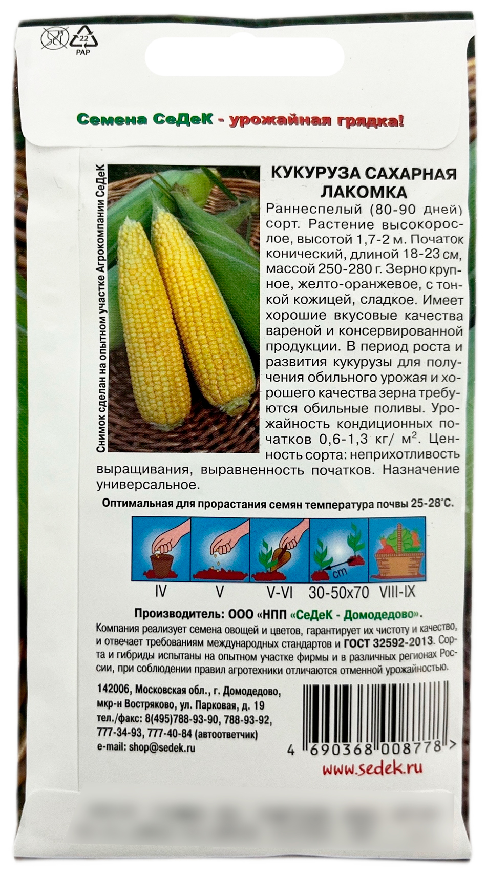 КУКУРУЗА ЛАКОМКАРаннеспелый (80-90 дней) сорт. Растение высокорослое, высотой 1,7-2 м. Початок конический, длиной 18-23 см, массой 250-280 г. Зерно крупное, желто-оранжевое, с тонкой кожицей, сладкое. Имеет хорошие вкусовые качества вареной и консервированной продукции. В период роста и развития кукурузы для получения обильного урожая и хорошего качества зерна требуются обильные поливы. Урожайность кондиционных початков 0,6-1,3 кг/ м2. Ценность сорта: неприхотливость выращивания, выравненность початков. Назначение универсальное.