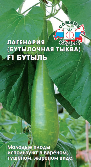 Лагенария Бутыль F1 (Бутылочная тыква)Среднеспелый гибрид. Созревание плодов наступает через 65-75 дней после всходов. Однолетнее теплолюбивое, сильнорослое и сильноветвистое растение, с нежно-зелеными, слегка опущенными, крупными листьями и белыми крупными цветками. Плоды напоминают форму бутыли, зеленые, с бледными кремовыми пятнами, гладкие, с плотной корой, длиной 30 см, диаметром 13 см. Польза лагенарии обусловлена богатым составом витаминов и микроэлементов. Рекомендуется внести этот овощ в свой рацион питания людям с ожирением и сахарным диабетом, в качестве профилактики и в период лечения заболеваний ЖКТ, печени, почек, мочевого пузыря. В пищу употребляют только нежные молодые завязи со сладковатым вкусом в вареном, тушеном, жареном виде. Вызревшие плоды, после удаления их содержимого и подсушивания, применяют в качестве сосудов для хранения жидкостей и сыпучих продуктов. Такая посуда чрезвычайно прочная и совершенно водонепроницаемая.