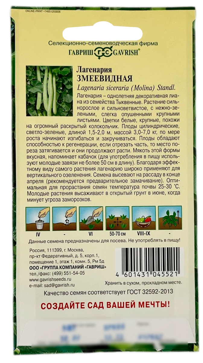 Лагенария Змеевидная ГАВРИШЛагенария — однолетняя декоративная лиана из семейства Тыквенные. Растение сильнорослое и сильноветвистое, с нежно-зелеными, слегка опушенными крупными листьями. Цветки белые, крупные, похожи на огромный раскрытый колокольчик. Плоды цилиндрические, светло-зеленые, длиной 1,5-2,0 м, массой 3,0-7,0 кг, обладают способностью к регенерации, если отрезать часть, то место пореза затягивается и они продолжают расти. Мякоть этой формы вкусная, напоминает кабачок (для употребления в пищу используют молодые завязи не более 50 см в длину). Благодаря эффектному виду самого растения лагенарию широко применяют для вертикального озеленения. Семена высевают на рассаду в конце апреля (рекомендуется предварительное замачивание). Оптимальная для прорастания семян температура почвы 25-30°С. Молодые растения высаживают в открытый грунт в июне, когда минует угроза заморозков.