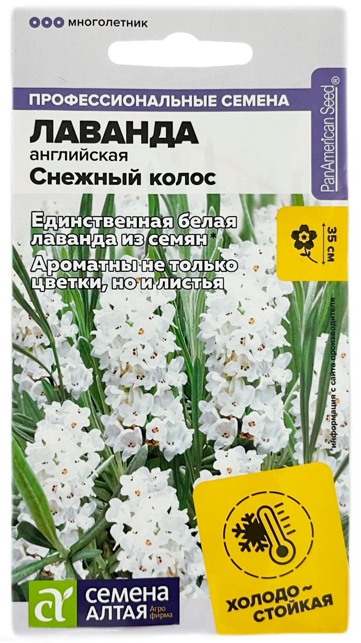Лаванда английская СНЕЖНЫЙ КОЛОС СЕМЕНА АЛТАЯЗимостойкая многолетняя культура, хорошо переносит пониженные температуры. Растения этого сорта отличаются активным ветвлением, выравненным габитусом, однородностью соцветий, ранним и продолжительным цветением. Формирует колосовидные соцветия с белоснежными цветками. Отлично подходит для выращивания в кашпо, вазонах, в бордюрных посадках, на клумбах. Используется в качестве сухоцвета.