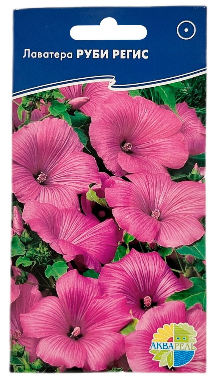 Лаватера РУБИ РЕГИС АКВАРЕЛЬКустистое растение высотой 60 см, длительно и ярко цветущее одиночными воронковидными цветами диаметром 6-10 см, карминно-розового цвета. Фаворит среди летников. Украсит любое место в саду. Красива как цветущая изгородь и ширма. Привлекательно в посадках с дельфиниумом, табаком. Срезанные цветы сохраняют декоративность до 7 дней.
