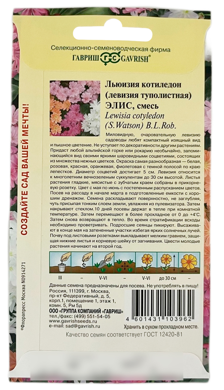 Льюизия котиледон ЭЛИС смесь ГАВРИШМиловидную, очаровательную левизию садоводы любят компактный изящный вид и пышное цветение. Не уступает по декоративности другим растениям. Придаст любой альпийской горке или рокарию необычайно, запоминающийся вид своими яркими шаровидными соцветиями, состоящих из множества нежных цветков. Окраска самая разнообразная – белая, розовая, красная, оранжевая, фиолетовая с темной полосой по краю лепестков. Диаметр соцветий достигает 5 см. Левизия– относится к многолетним вечнозеленым суккулентам до 30 см высотой. Листья растения гладкие, мясистые с зубчатым краем собраны в прикорневую розетку. Цвет с мая по июнь с постепенным распусканием цветов. Посев на рассаду в начале марта в подготовленные емкости с хорошим дренажом. Семена раскладывают поверхностно, не заглубляя, чуть присыпая тонким слоем земли, увлажняя из пулевизатора. Затем накрывают стеклом.10 дней посевы держат в тепле при комнатной температуре. Затем перемещают в более прохладное от 0 до +4 град С. Затем снова возвращают в тепло. Во время стратификации всходы необходимо проветривать. Подросшие сеянцы пикируют. Высаживают в конце мая на затененные участки избегая ярких солнечных лучей. Почву под листовыми розетками выкладывают мелким гравием, защищая нижние листья и корневую шейку от загнивания. Цвести молодые растения начинают на второй год.