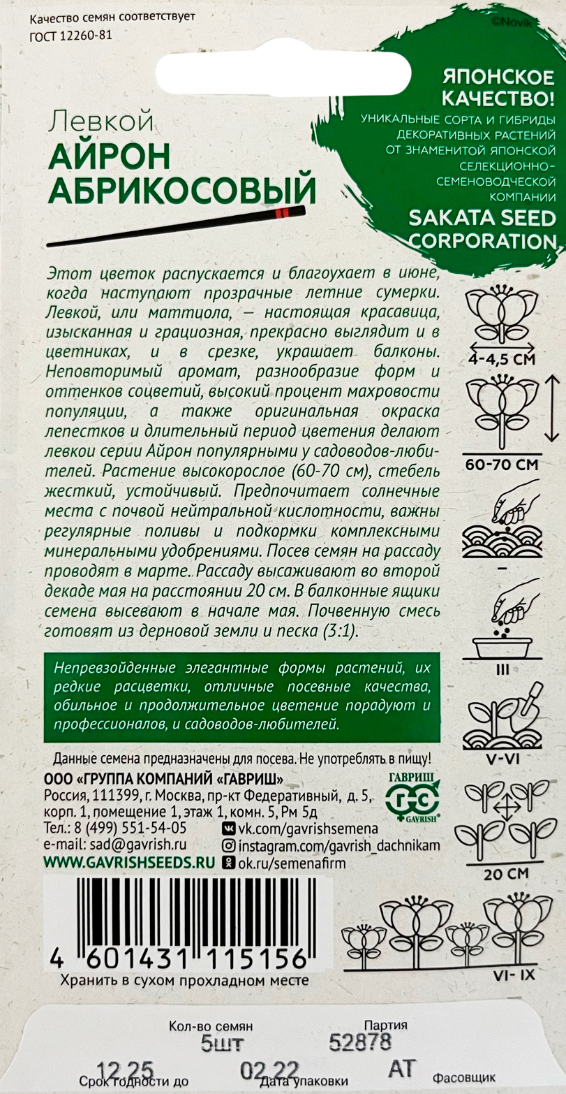 Левкой Айрон абрикосовый 5 шт. Саката серия Эксклюзив Н22Этот цветок распускается и благоухает в июне, когда наступают прозрачные летние сумерки. Левкой, или маттиола, - настоящая красавица, изысканная и грациозная, - прекрасно выглядит и в цветниках, и в срезке, украшает балконы. Неповторимый аромат, разнообразие форм и оттенков соцветий, высокий процент махровости популяции, а также оригинальная окраска листьев и длительный период цветения делают левкои серии Айрон популярными у садоводов-любителей. Растение высокорослое (60-70 см), стебель жесткий, устойчивый. Предпочитает солнечные места с почвой нейтральной кислотности, важны регулярные поливы и подкормки комплексными минеральными удобрениями. Посев семян на рассаду проводят в марте. Рассаду высаживают во второй декаде мая на расстоянии 20 см. В балконные ящики семена высевают в начале мая. Почвенную смесь готовят из дерновой земли и песка (3:1).