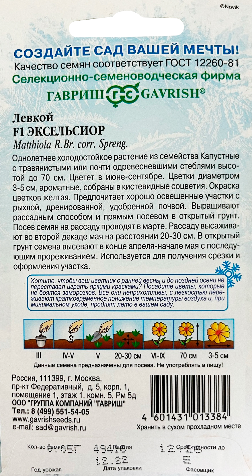 Левкой Эксельсиор* F1 0,05 г серия Устойчив к заморозкам!Однолетнее холодостойкое растение из семейства Капустные с травянистыми или почти одревесневшими стеблями высотой до70 см. Цветет в июне-сентябре. Цветки диаметром 3-5 см, ароматные, собраны в кистевидные соцветия. Окраска цветков желтая. Предпочитает хорошо освещенные участки с рыхлой, дренированной, удобренной почвой. Выращивают рассадным способом и прямым посевом в открытый грунт. Посев семян на рассаду проводят в марте. Рассаду высаживают во второй декаде мая на расстоянии 20-30 см. В открытый грунт семена высевают в конце апреля-начале мая с последующим прореживанием. Используется для получения срезки и оформления участка.