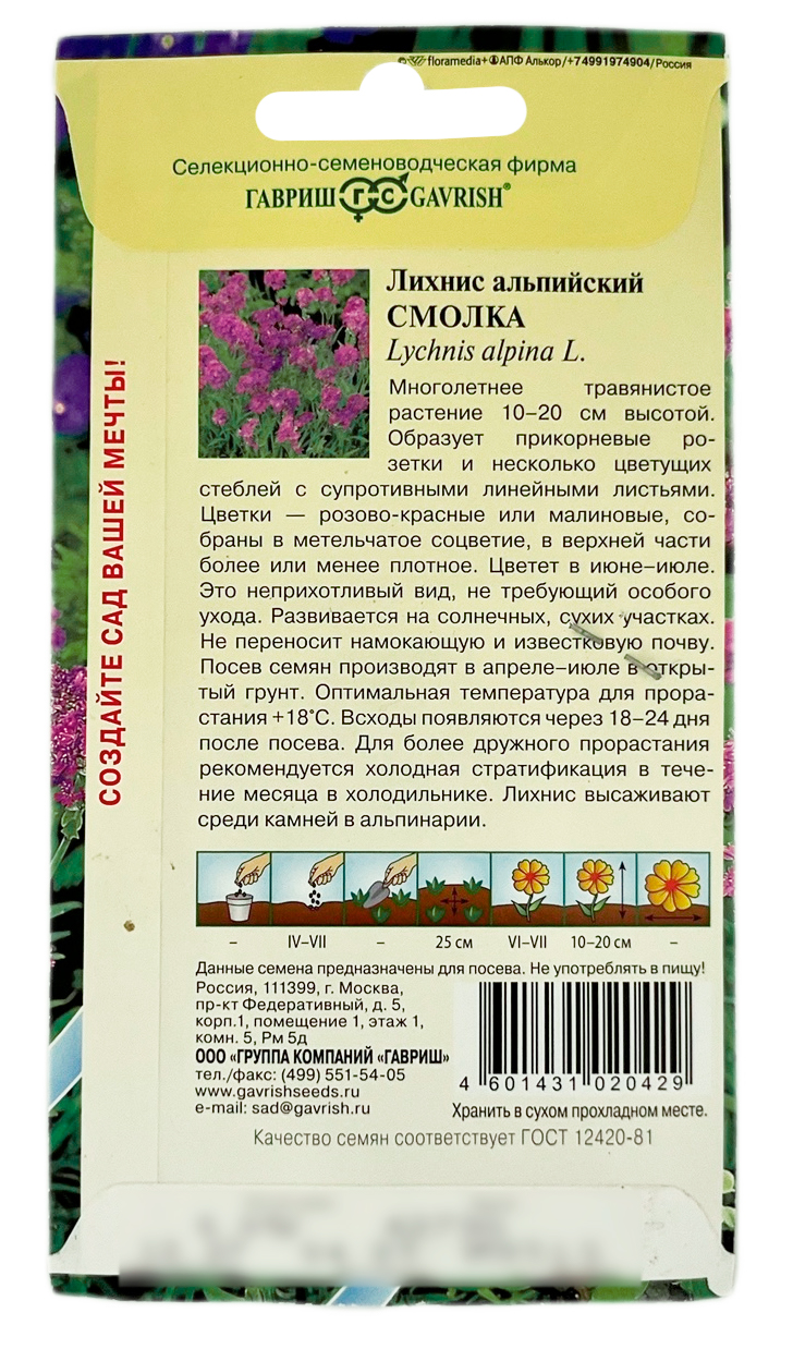 Лихнис альпийский СМОЛКА ГАВРИШМноголетнее травянистое растение 10-20 см высотой. Образует прикорневые розетки и несколько цветущих стеблей с супротивными линейными листьями. Стебли смолки альпийской в отличие от смолки обыкновенной - не клеящиеся. Цветки - розово-красные или малиновые, собраны в метельчатое соцветие, в верхней части более или менее плотное. Цветет в июне-июле. Это неприхотливый вид, не требующий особого ухода. Развивается на солнечных, сухих участках. Не переносит намокающую и известковую почву. Посев семян производят весной.